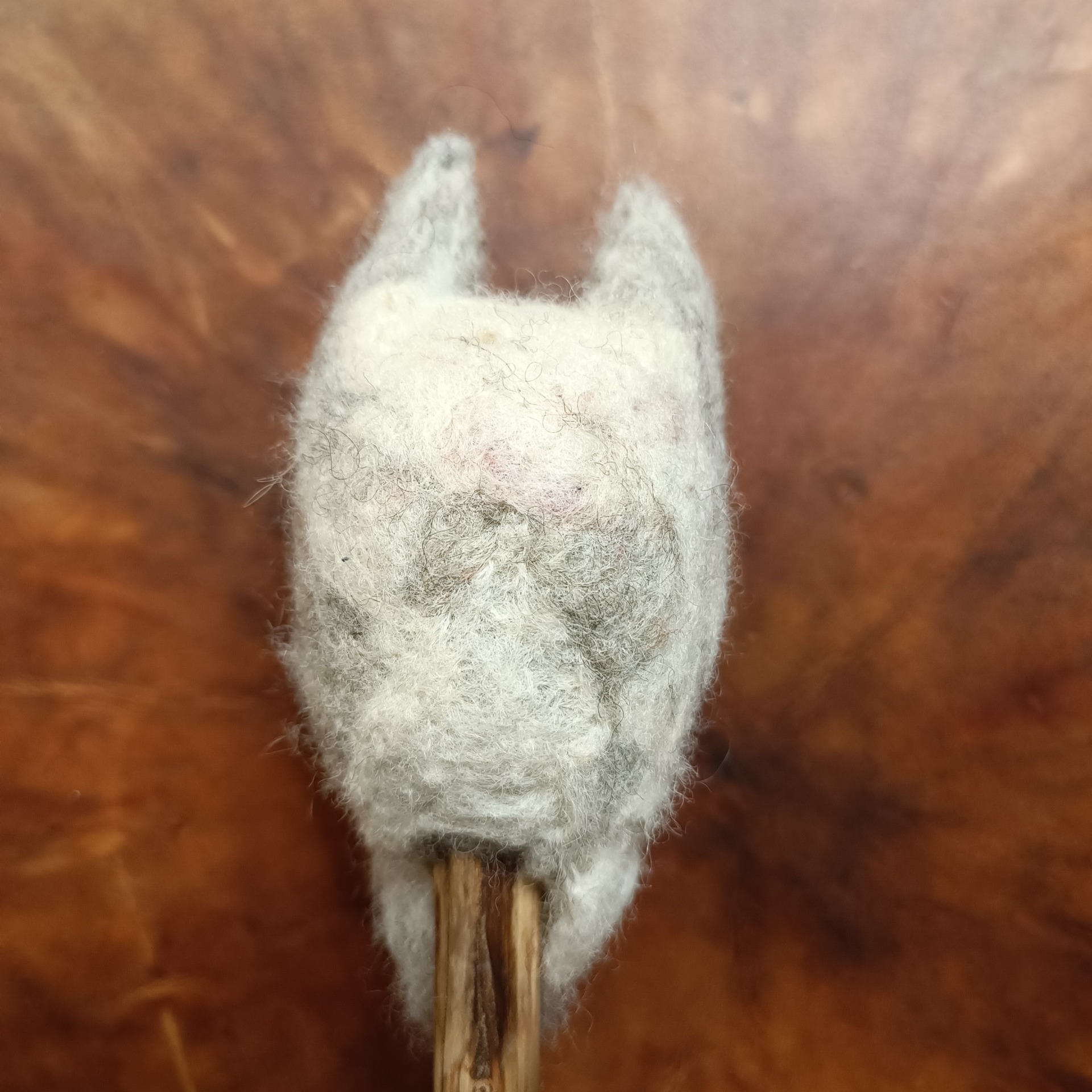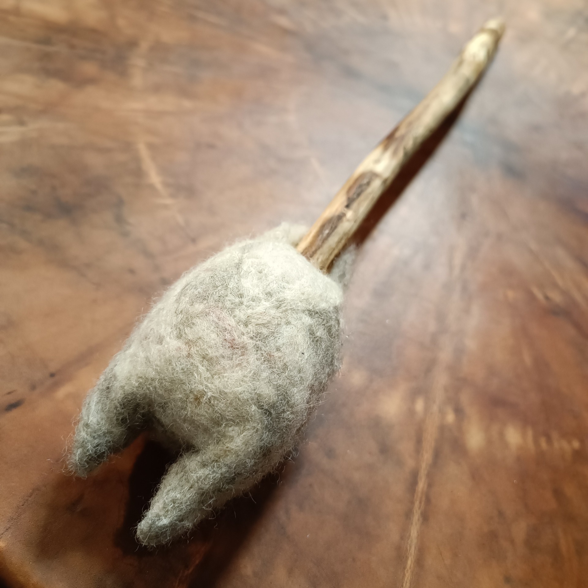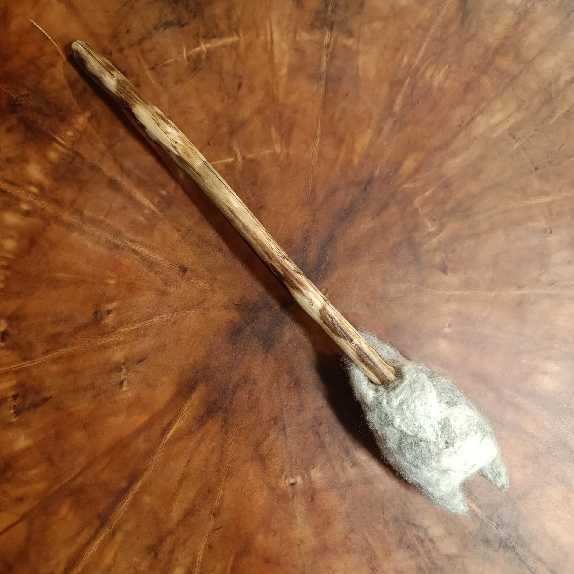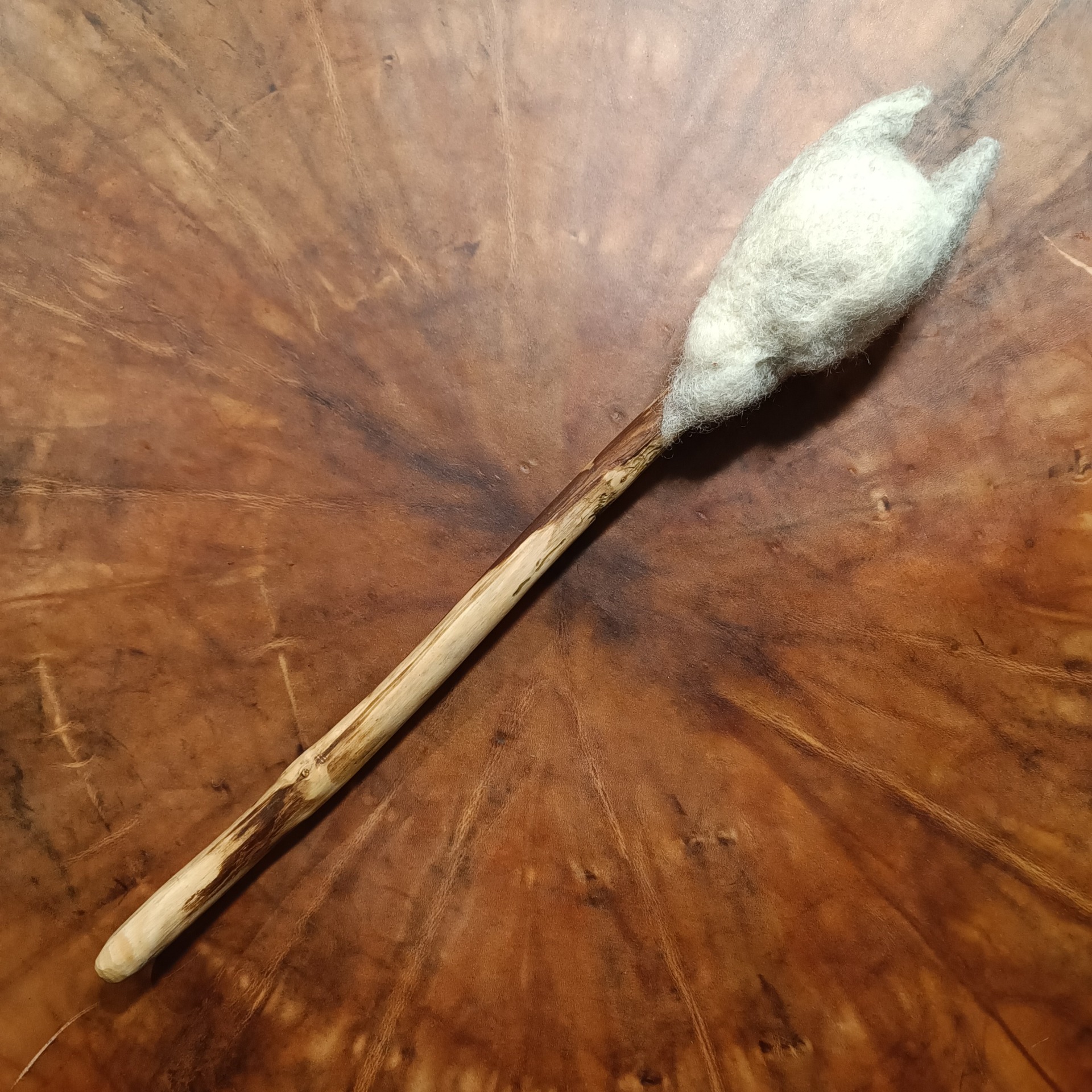 Kapulan varsi on kuusen oksa, käsitelty luonnonmukaisella puuvahalla. Soittopää lampaanvillasta märkähuovutettu. Villan alla on juuttinarua liimattu kierros kepin päähän, kitkakerrokseksi.Pituus noin 32 cm, kepin päästä korvankärkiin.