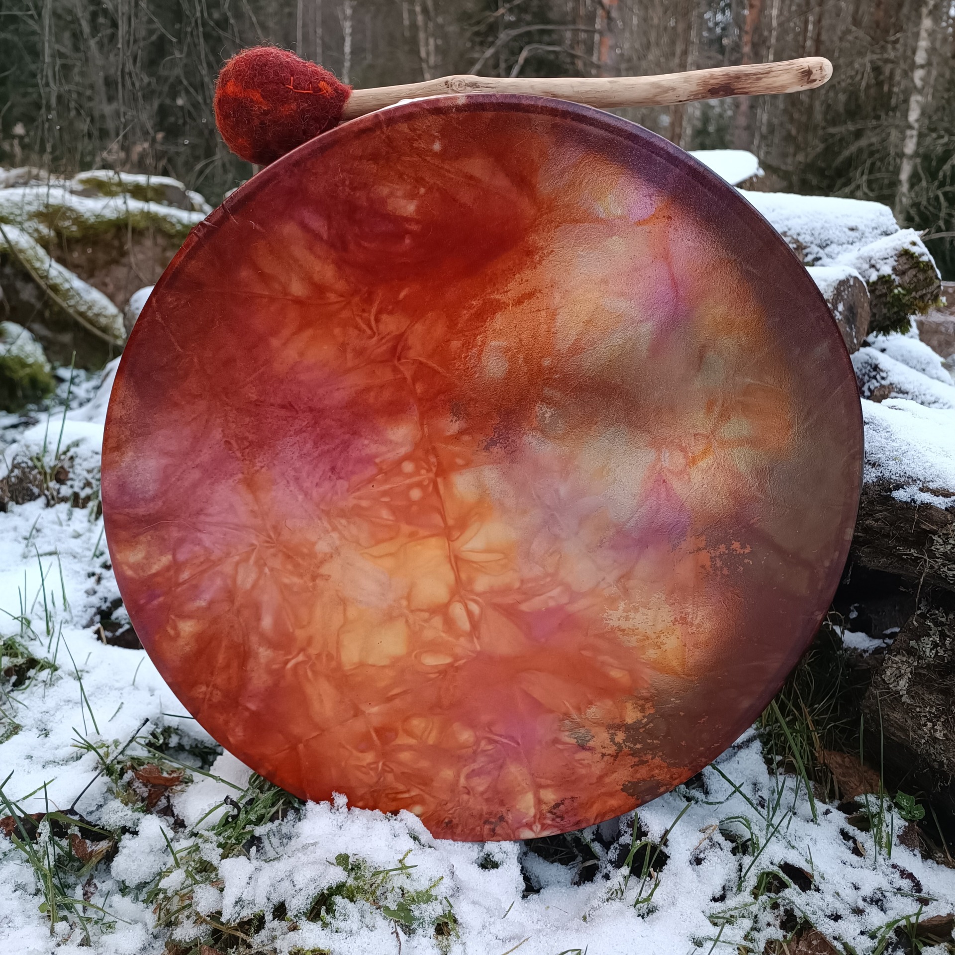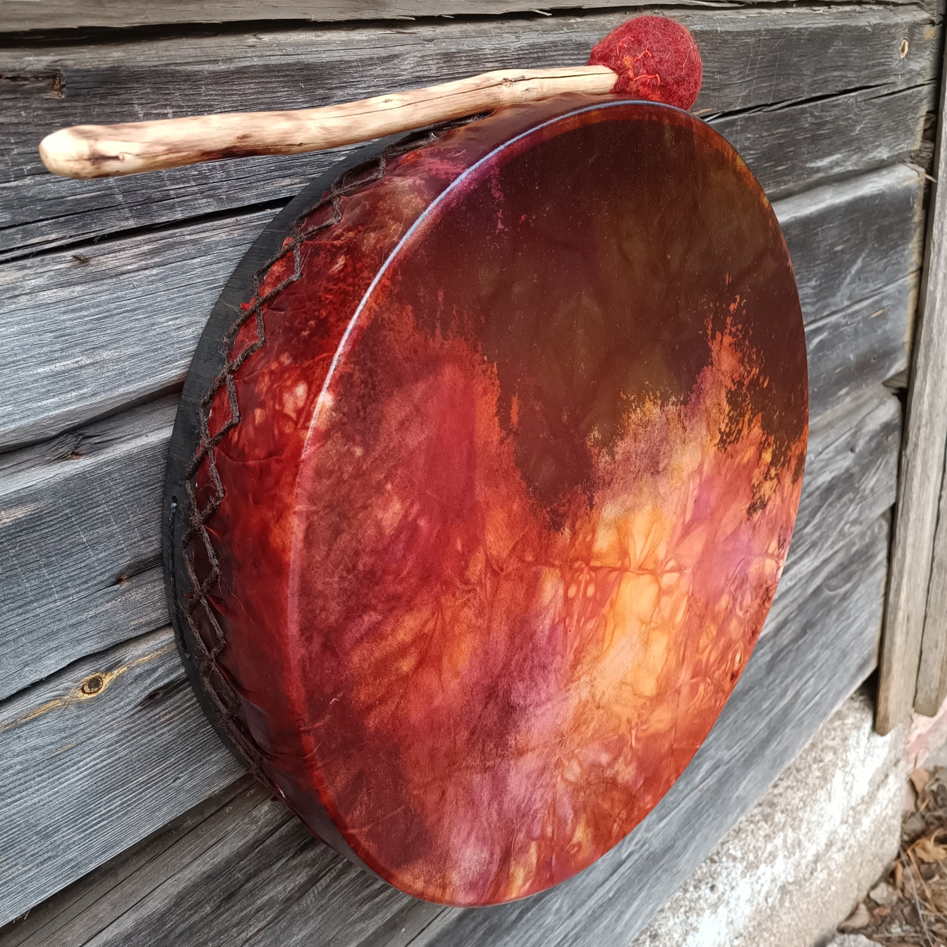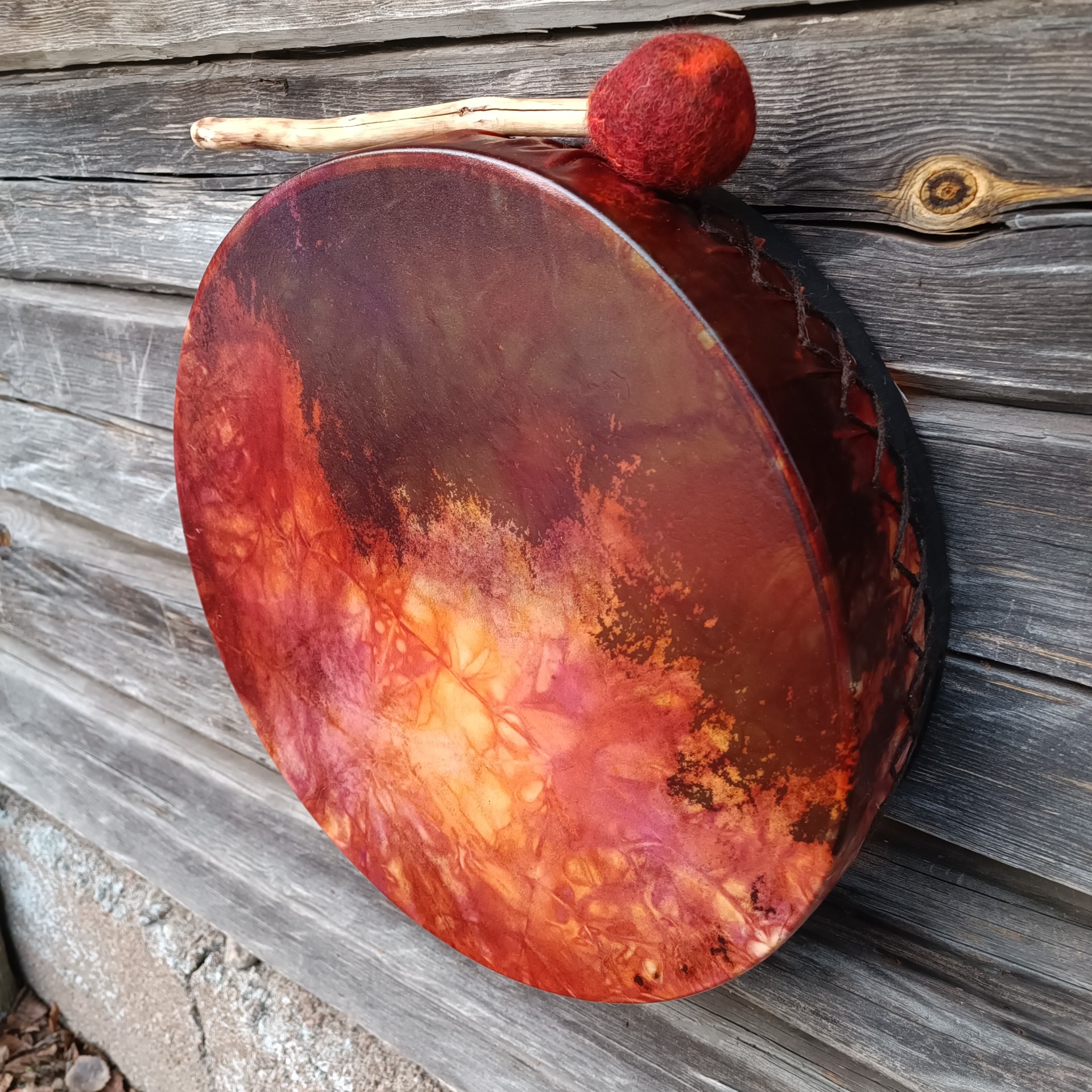 Rummun vahva poronnahkainen kalvo on värjätty vesipetsillä ja koivuvanerinen kehä käsitelty luonnonmukaisella puuvahalla. Kehän mitat 41x10cm, vahvuus 8 mm.