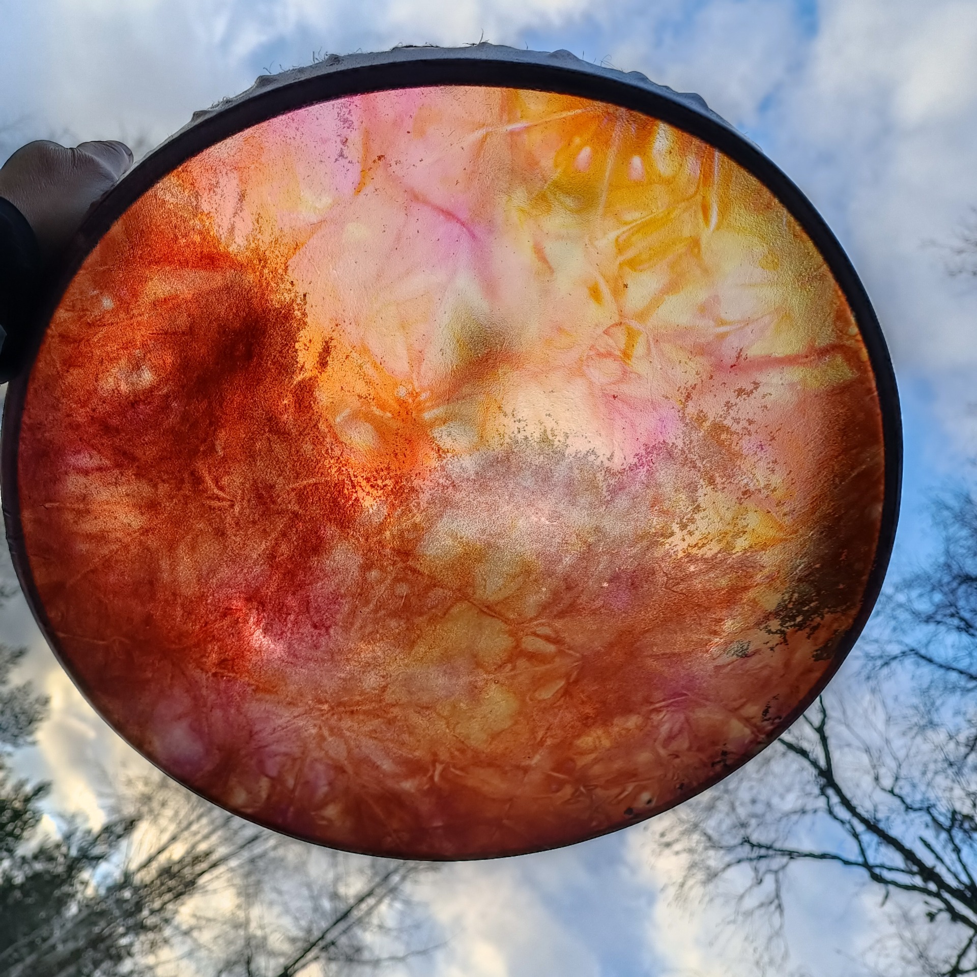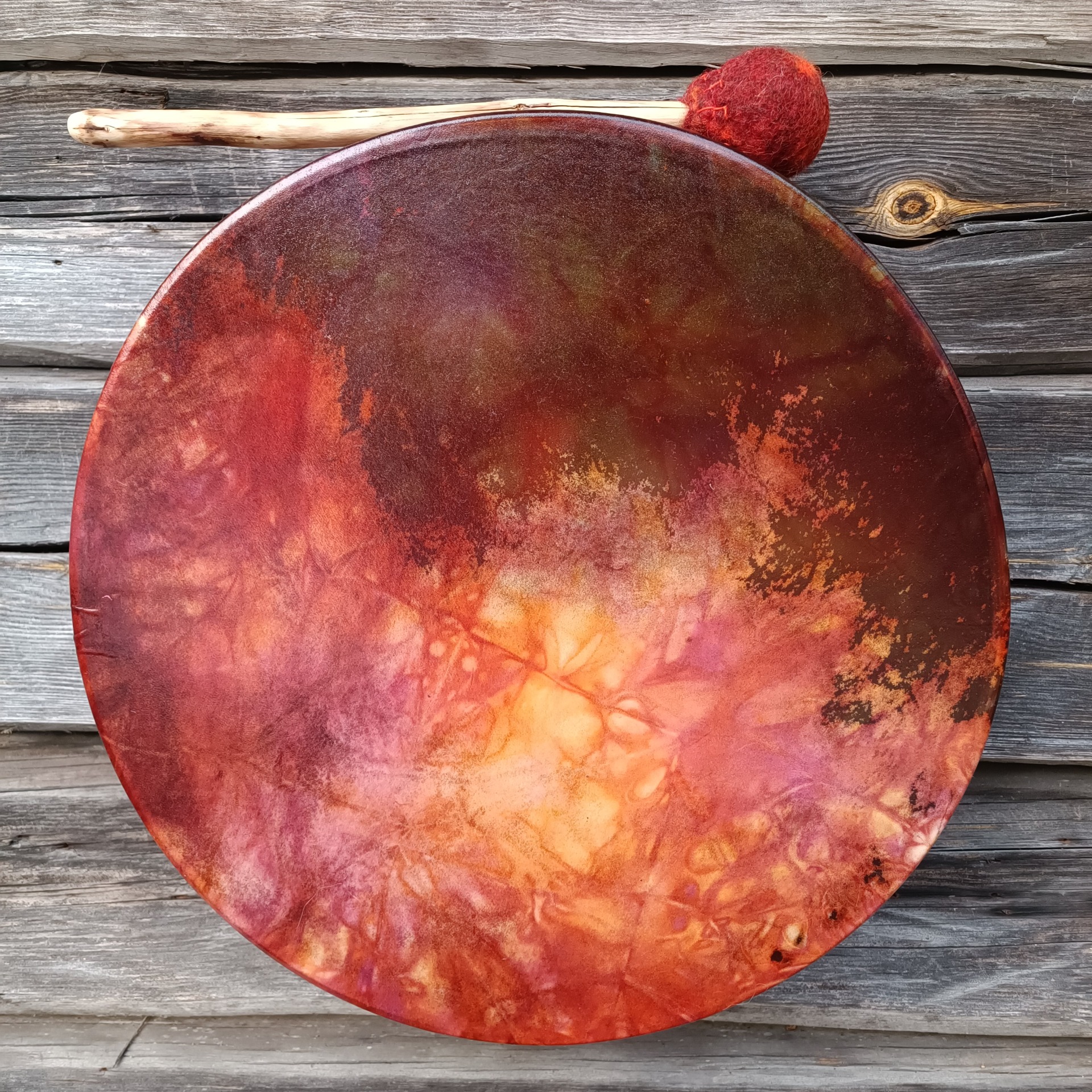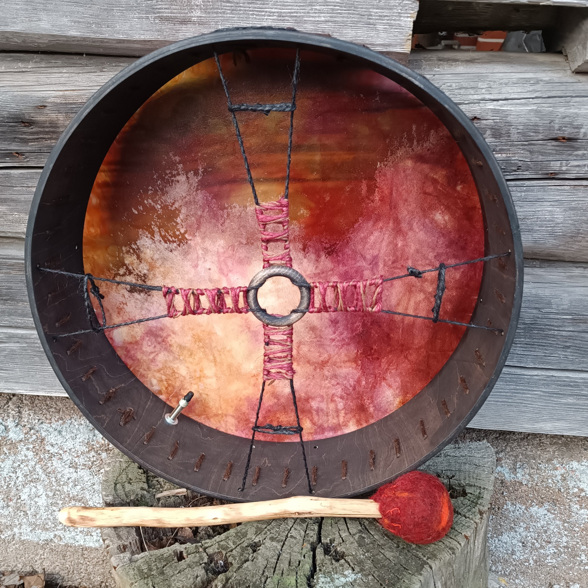 Rummun vahva poronnahkainen kalvo on värjätty vesipetsillä ja koivuvanerinen kehä käsitelty luonnonmukaisella puuvahalla. Kehän mitat 41x10cm, vahvuus 8 mm.