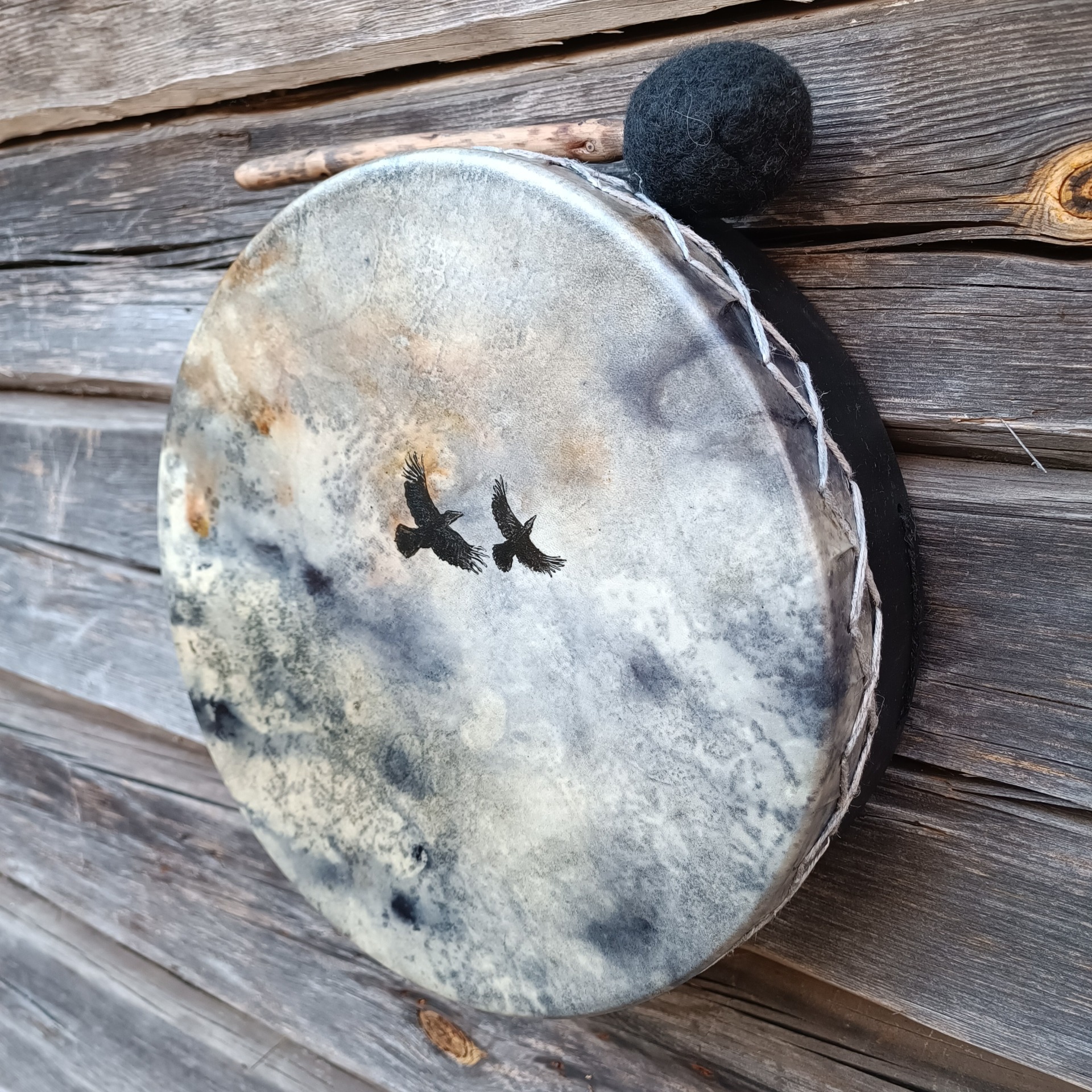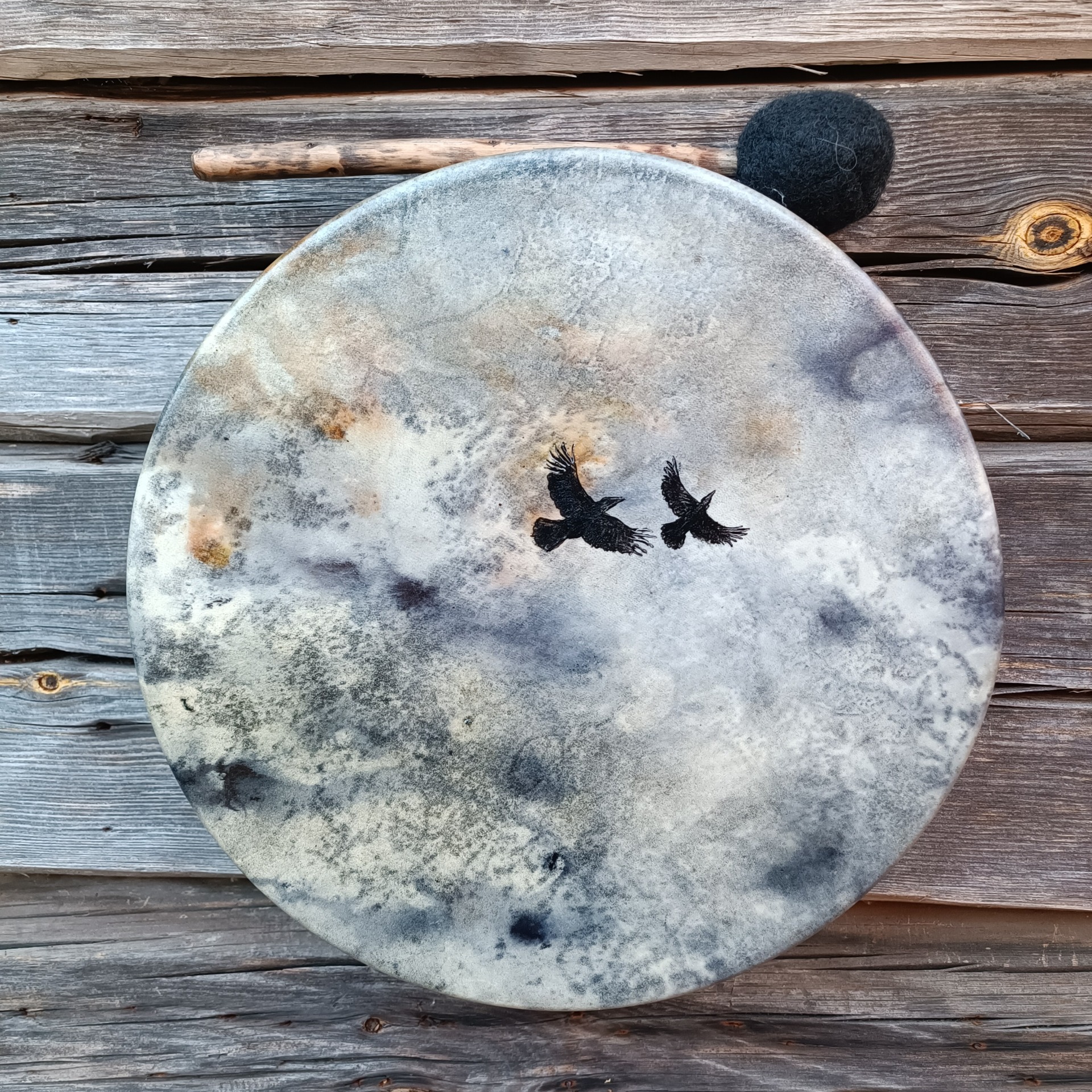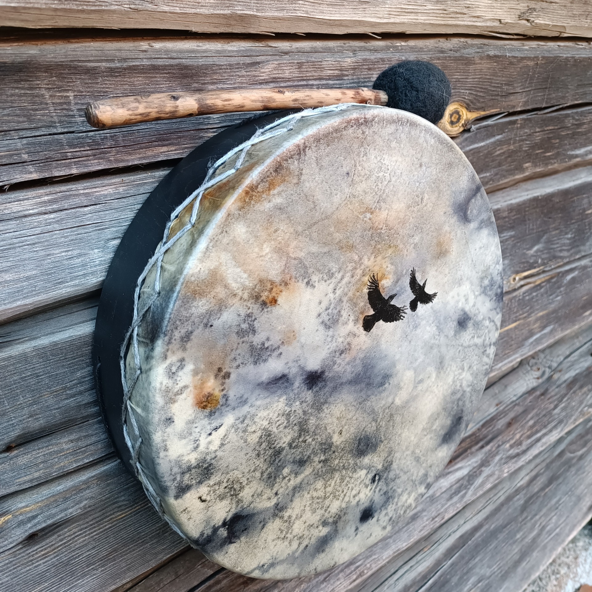 Pienen perusrummun poronnahkainen kalvo on värjätty vesipetsillä ja korpit maalattu akryylivärillä. Koivuvanerikehä 31x8 cm, käsitelty luonnonmukaisella puuvahalla.