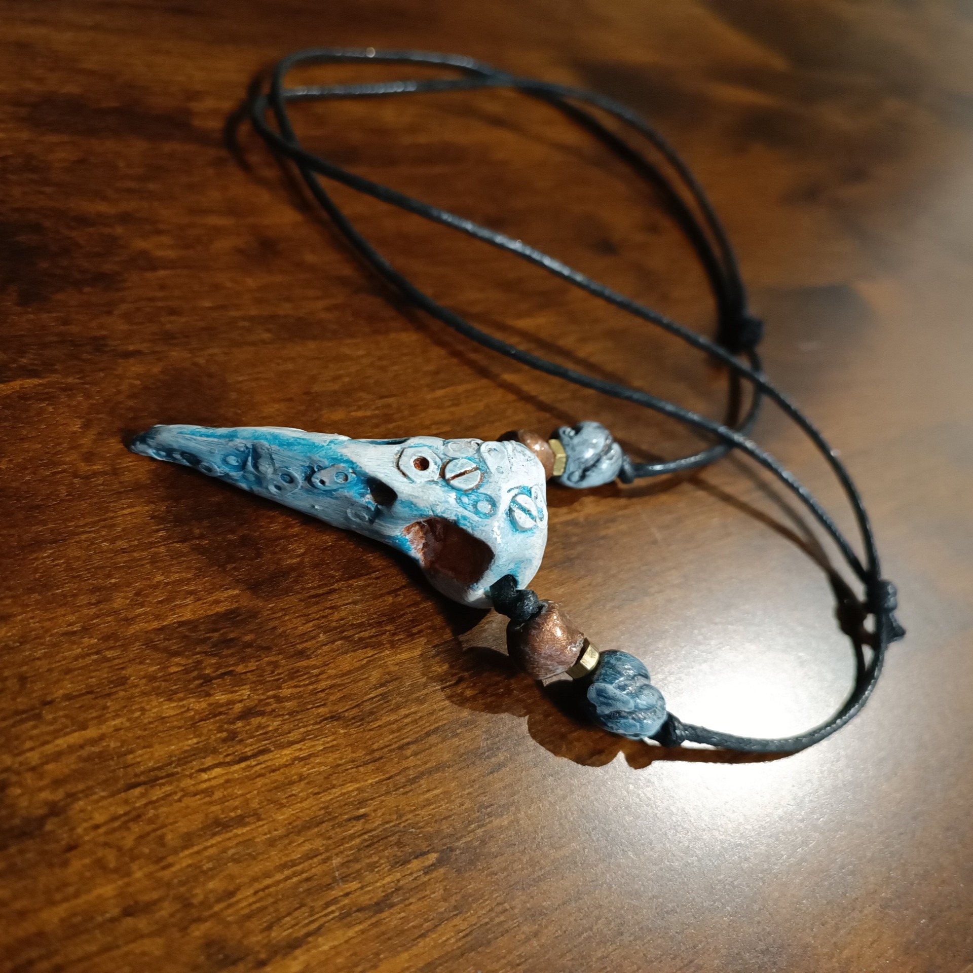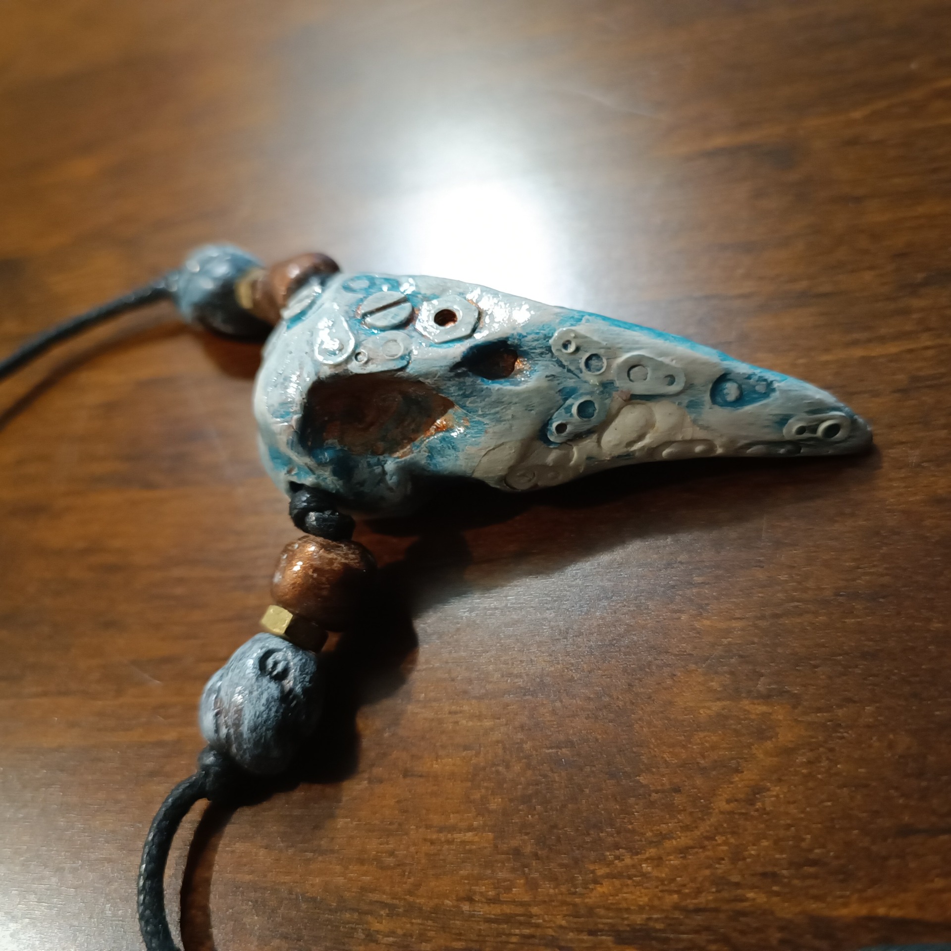 Koru on ilmassa kuivuvasta mineraalisavesta käsin muovailtu, uniikki. Pientä metallisälää upotettu koruun. Vahattu puuvillanyöri jonka pituus säädettävissä. Koru ei sisällä mitään eläinkunnan tuotteita.