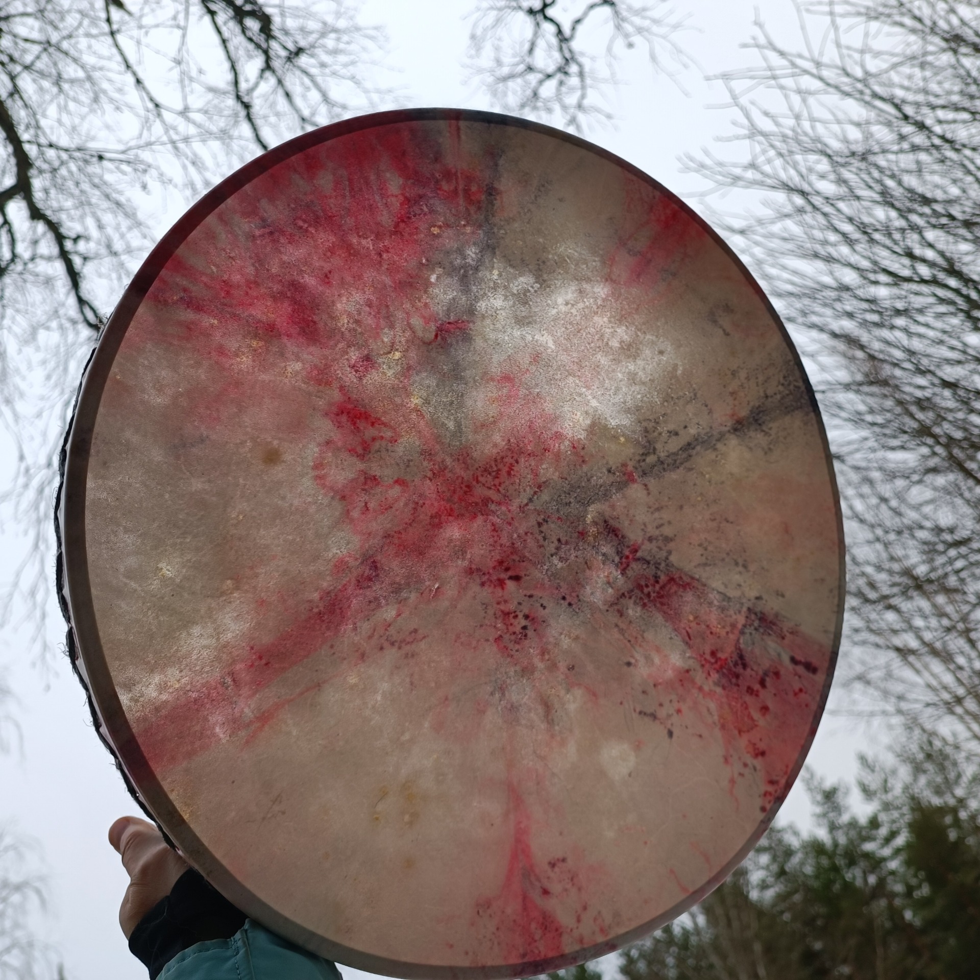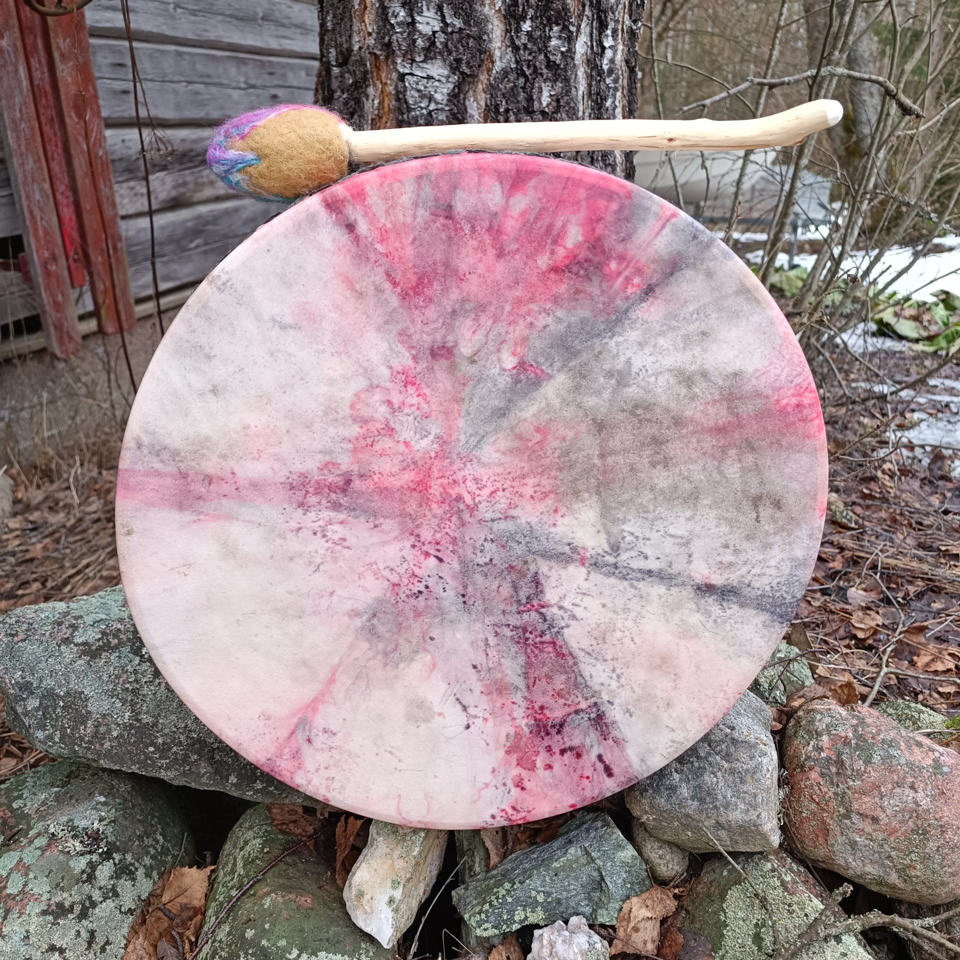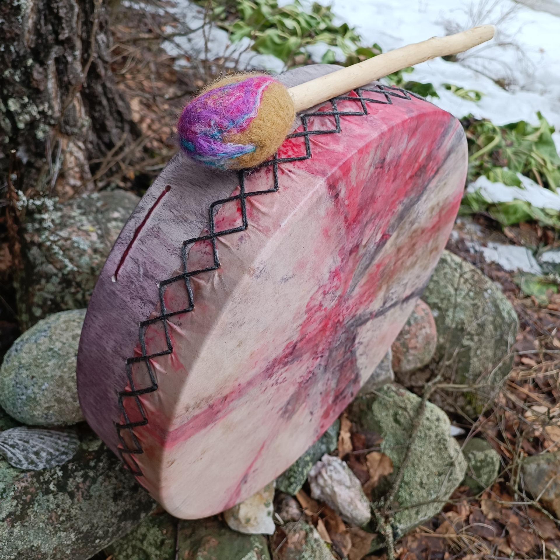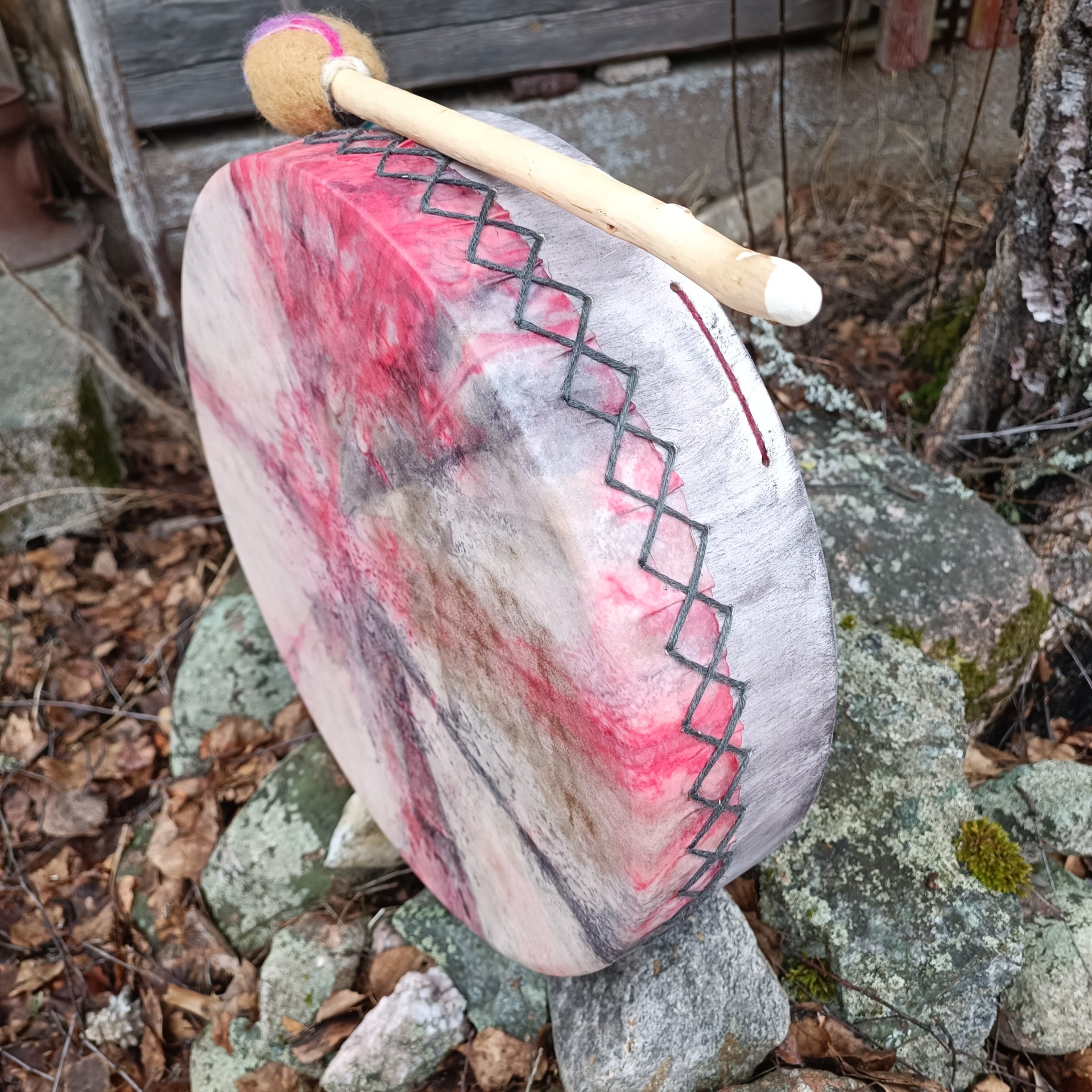 Perusrummun poronnahkainen kalvo on värjätty vesipetsillä ja koivuvanerinen kehä (41x10cm) käsitelty luonnonmukaisella puuvahalla.