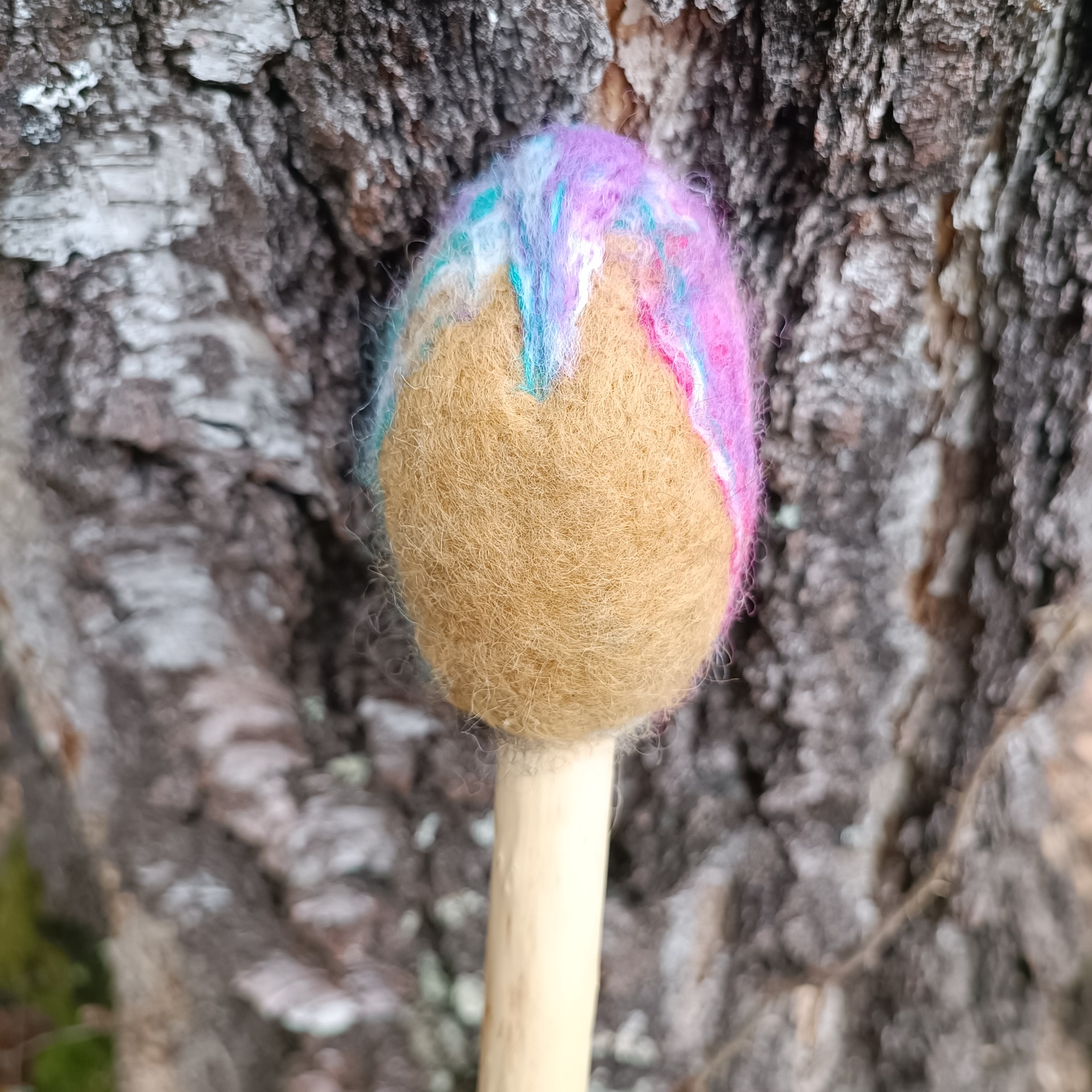 Soittokapulan varsi on käsittelemätön tammen oksa. Soittopää lampaanvillasta märkähuovutettu.