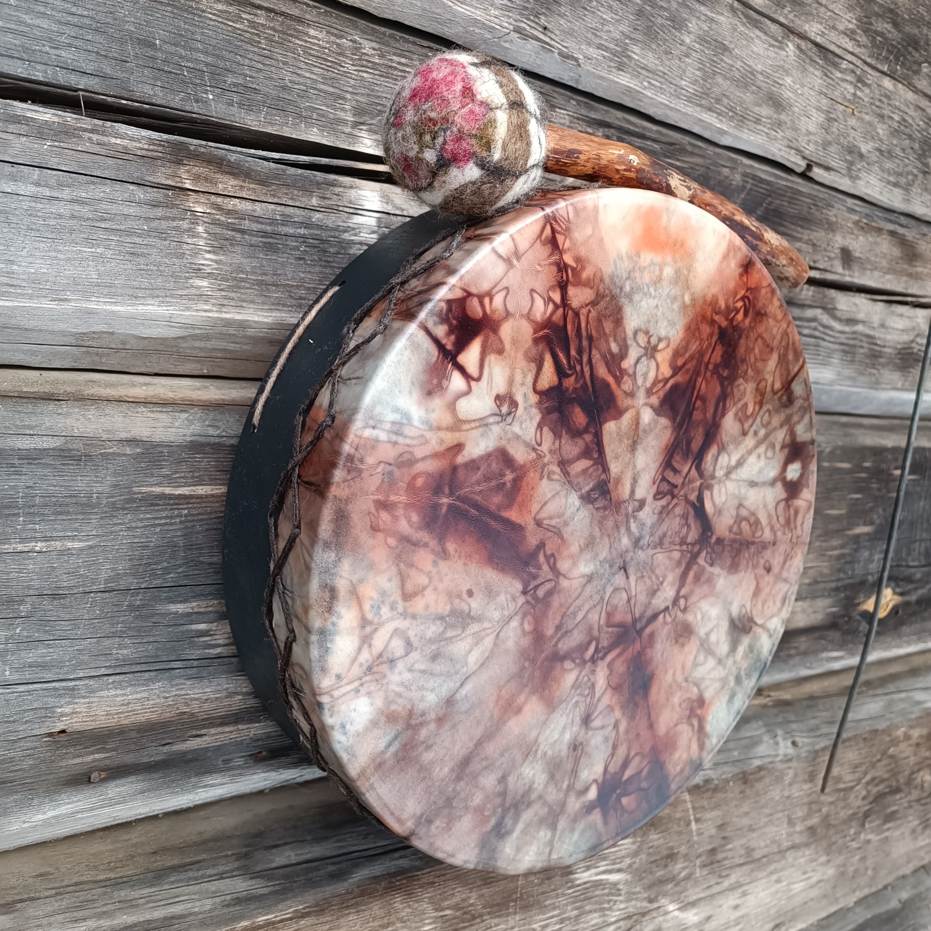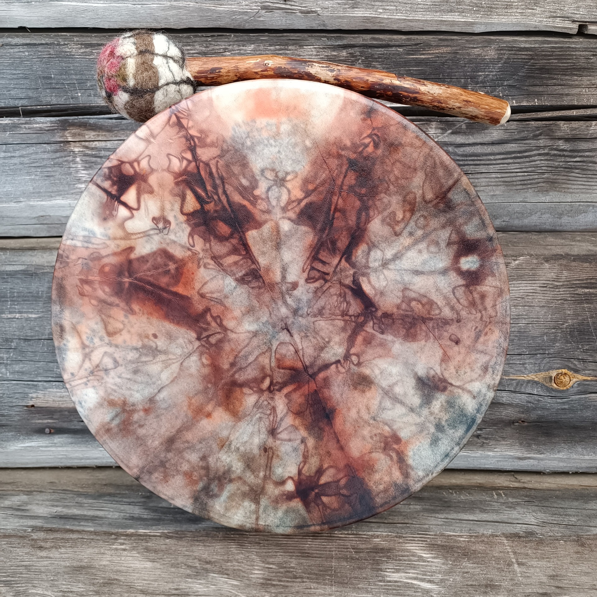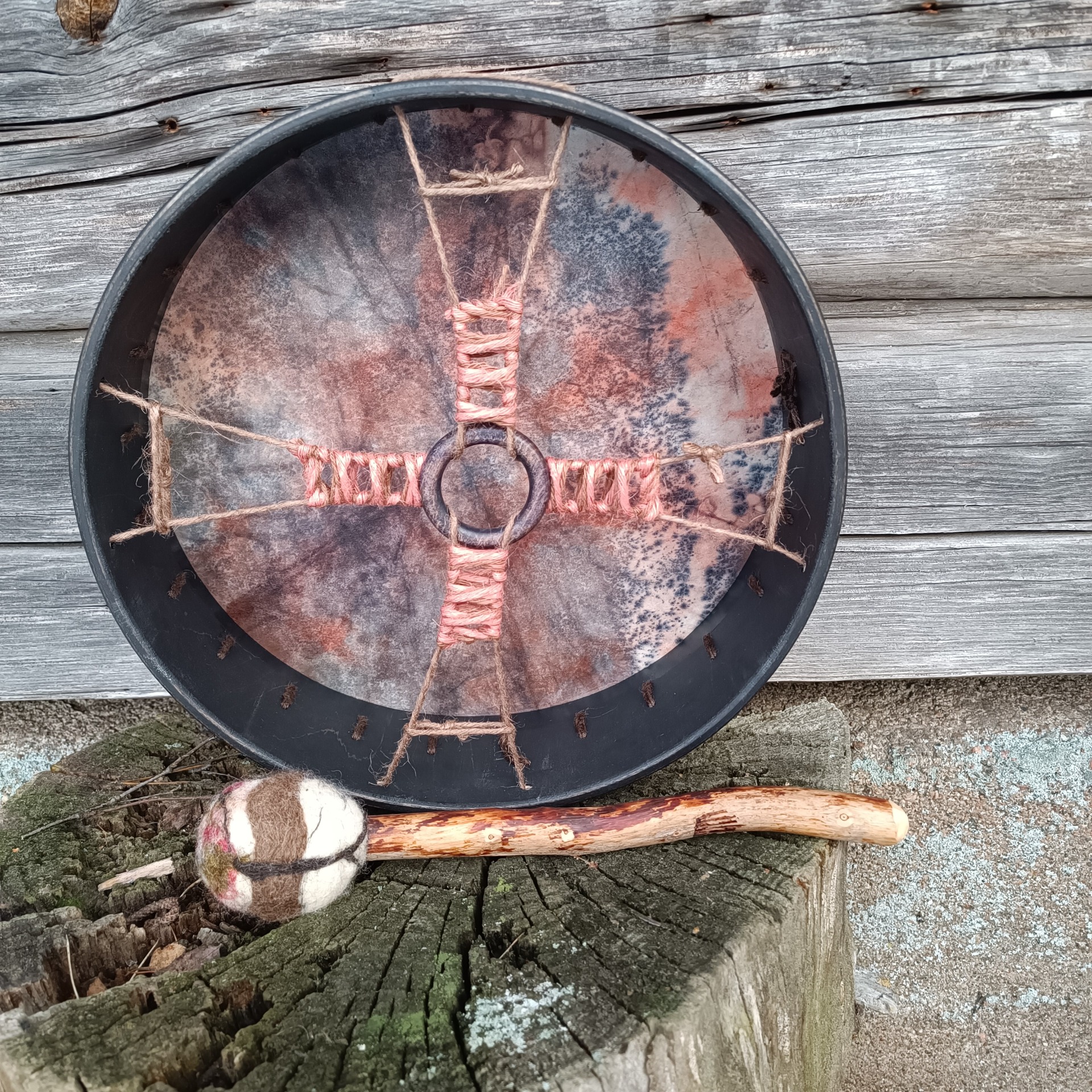 Mukaan tulee rummun hoito- ohjeet ja ohjeistus shamaanirummun vihkimiseen.