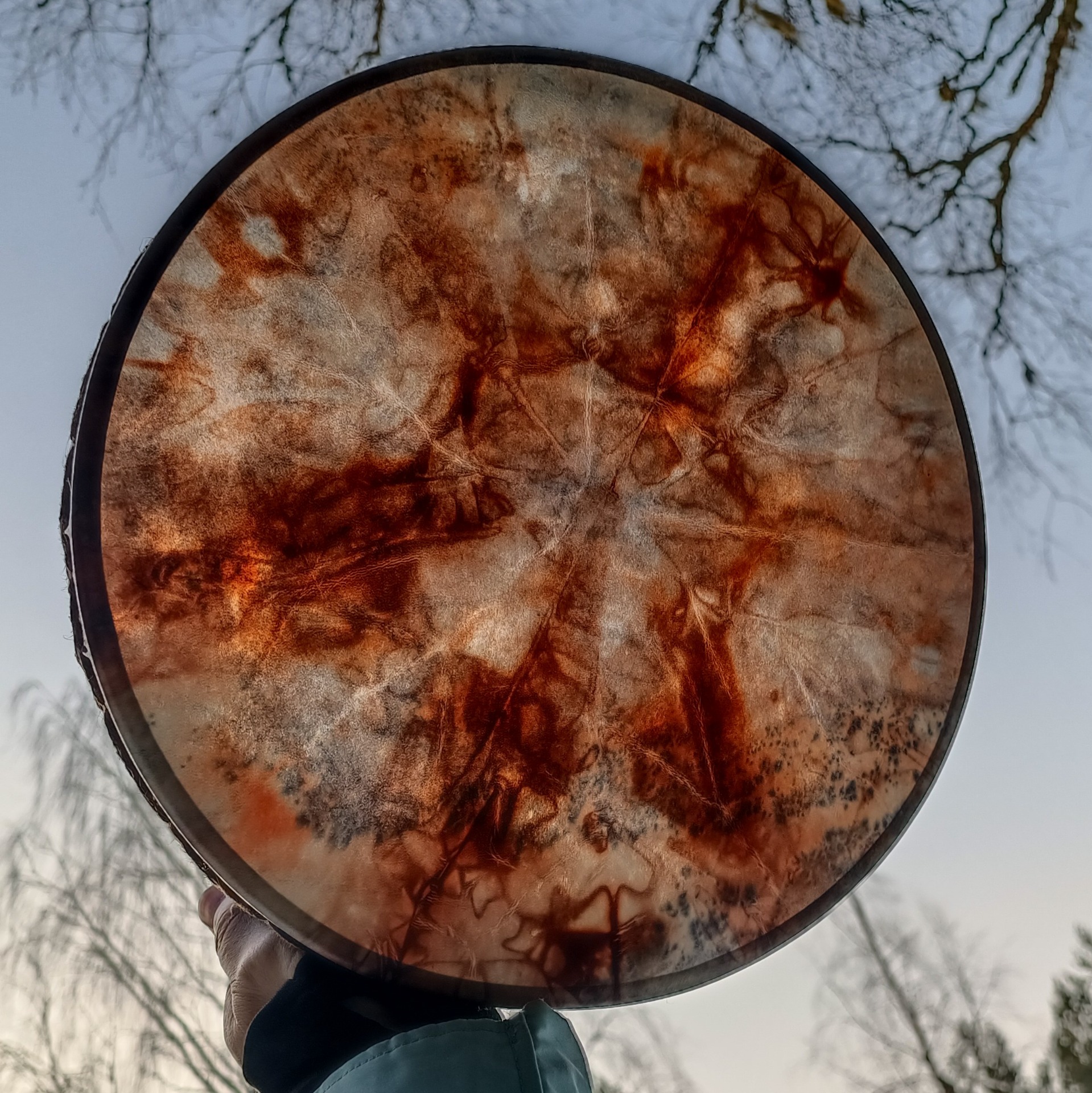 Pienen perusrummun poronnahkainen kalvo on värjätty vesipetsillä ja koivuvanerinen kehä käsitelty luonnonmukaisella puuvahalla.