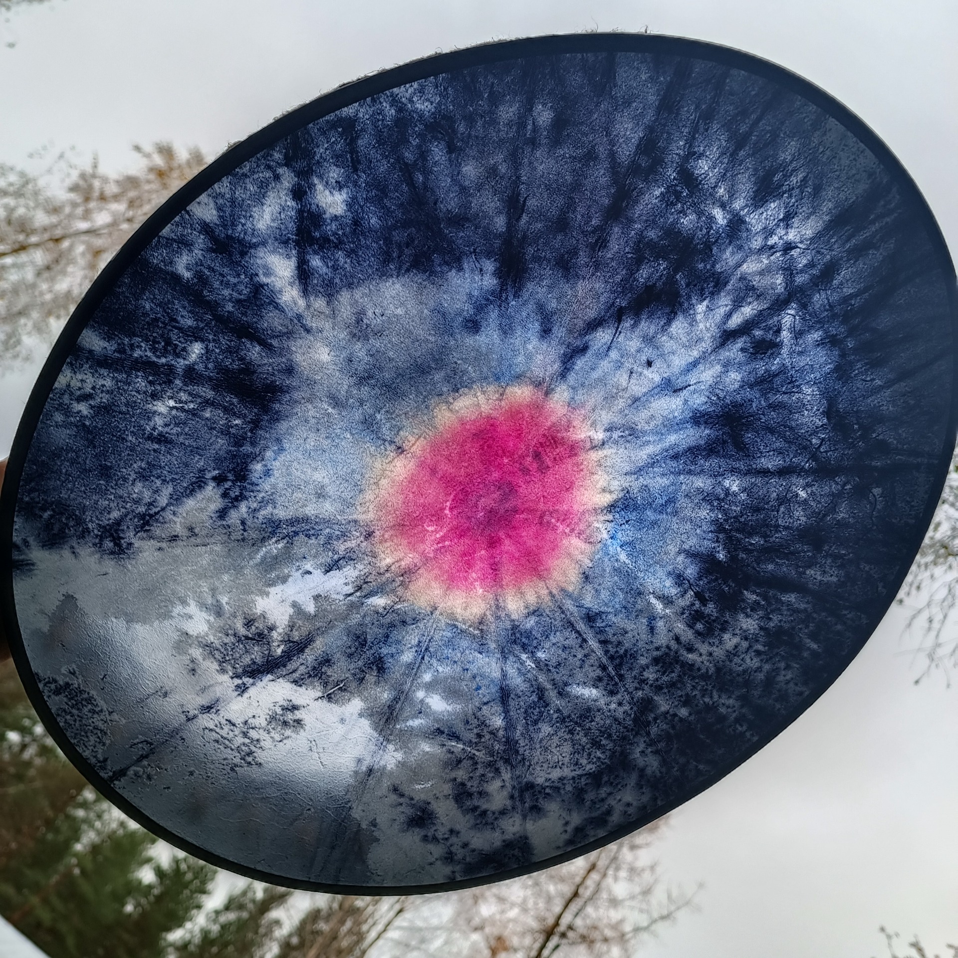 Soikean perusrummun poronnahkainen kalvo on värjätty vesipetsillä, koivuvanerinen kehä käsitelty luonnonmukaisella puuvahalla. Kehän mitat 37x46x10 cm, vahvuus 8mm.