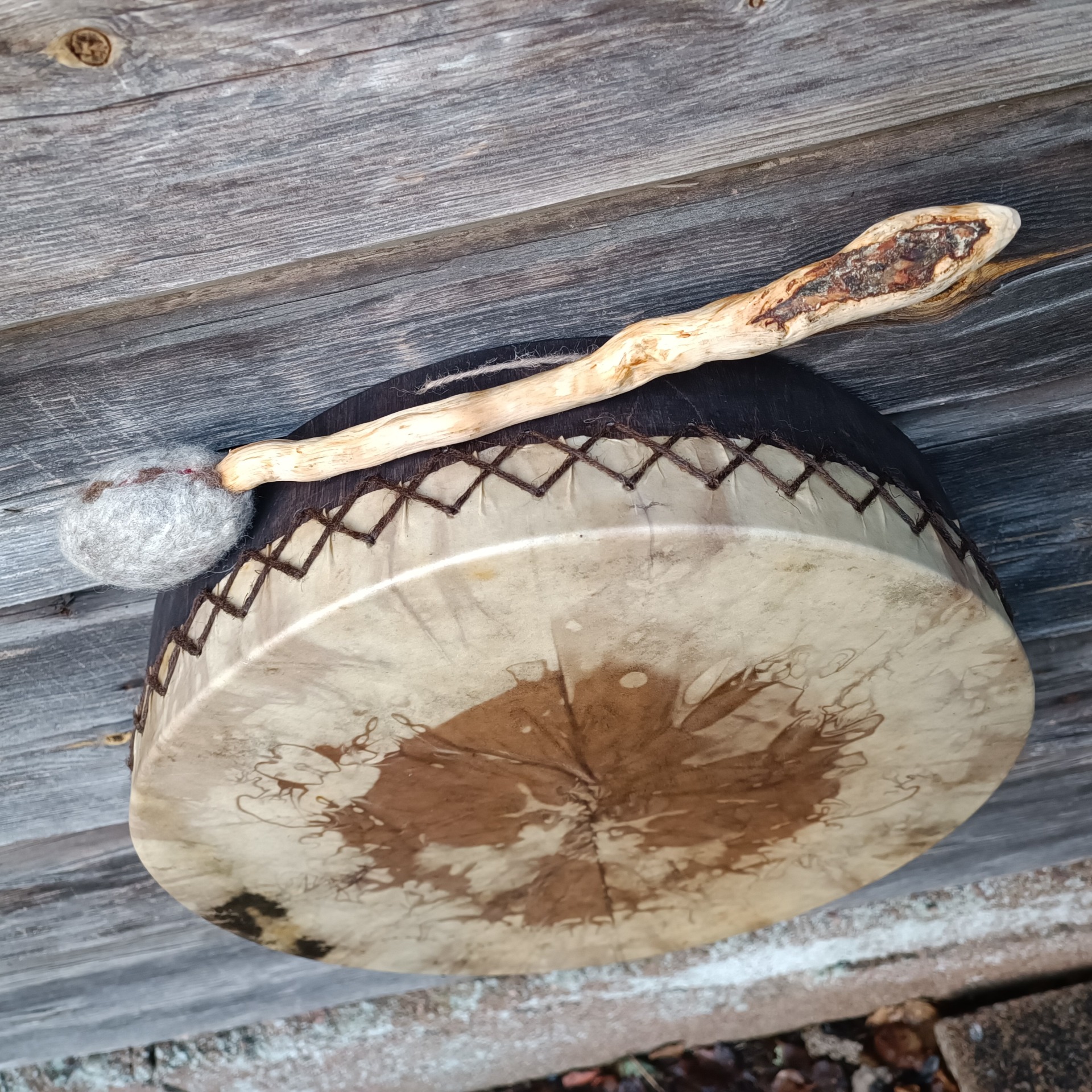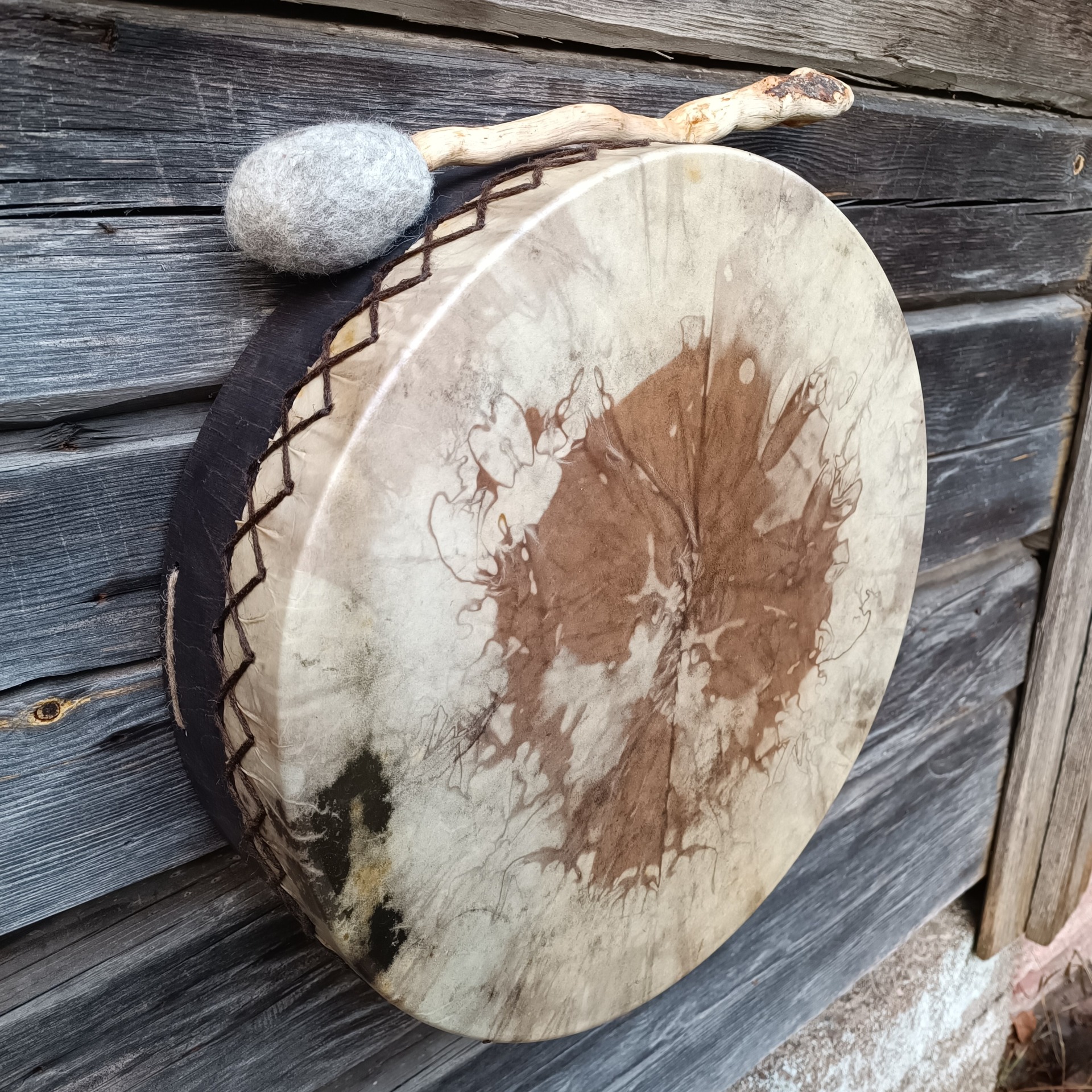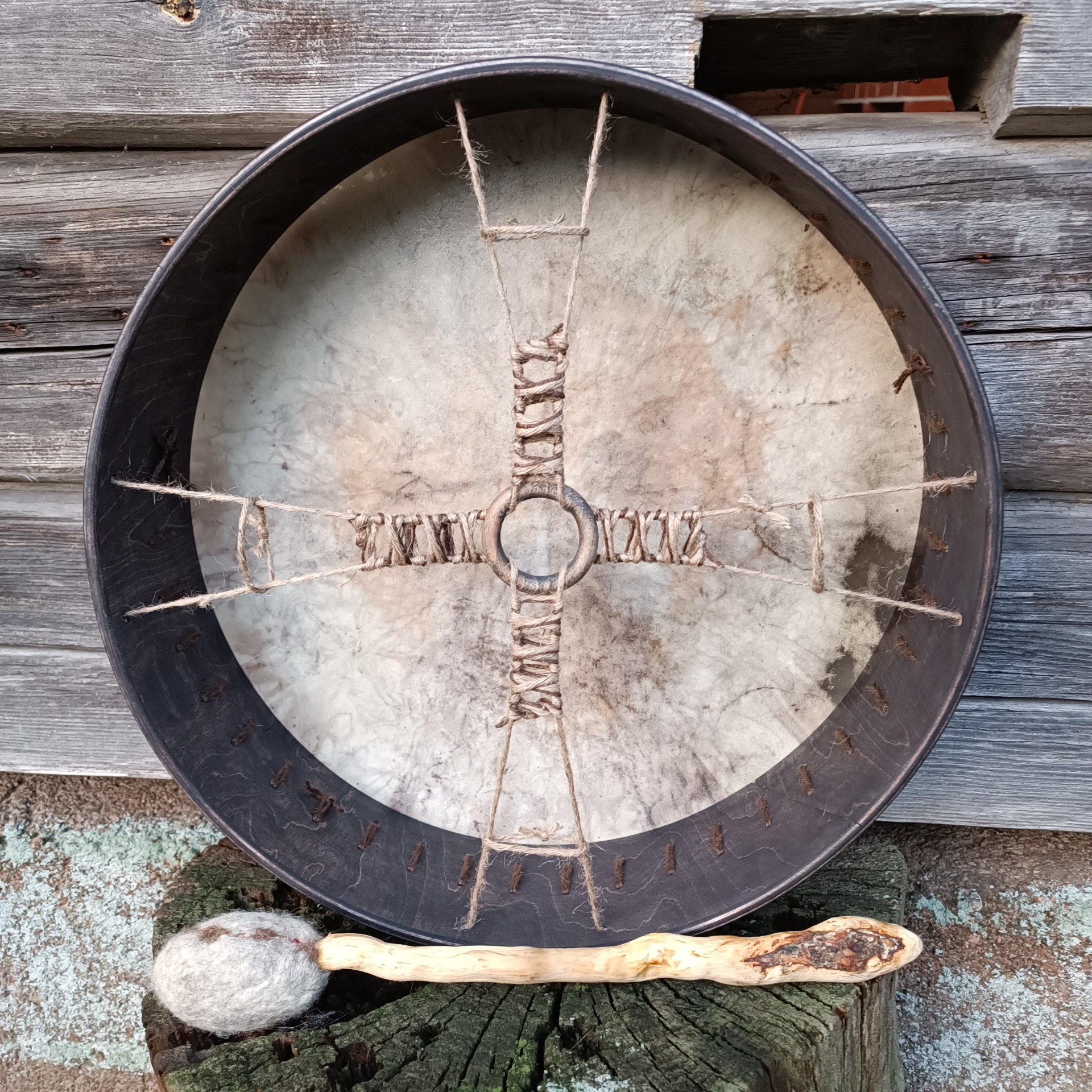 Perusrummun poronnahkainen kalvo on värjätty vesipetsillä ja koivuvanerinen kehä käsitelty luonnonmukaisella puuvahalla. Kehän mitat 41x10 cm, vahvuus 8mm.