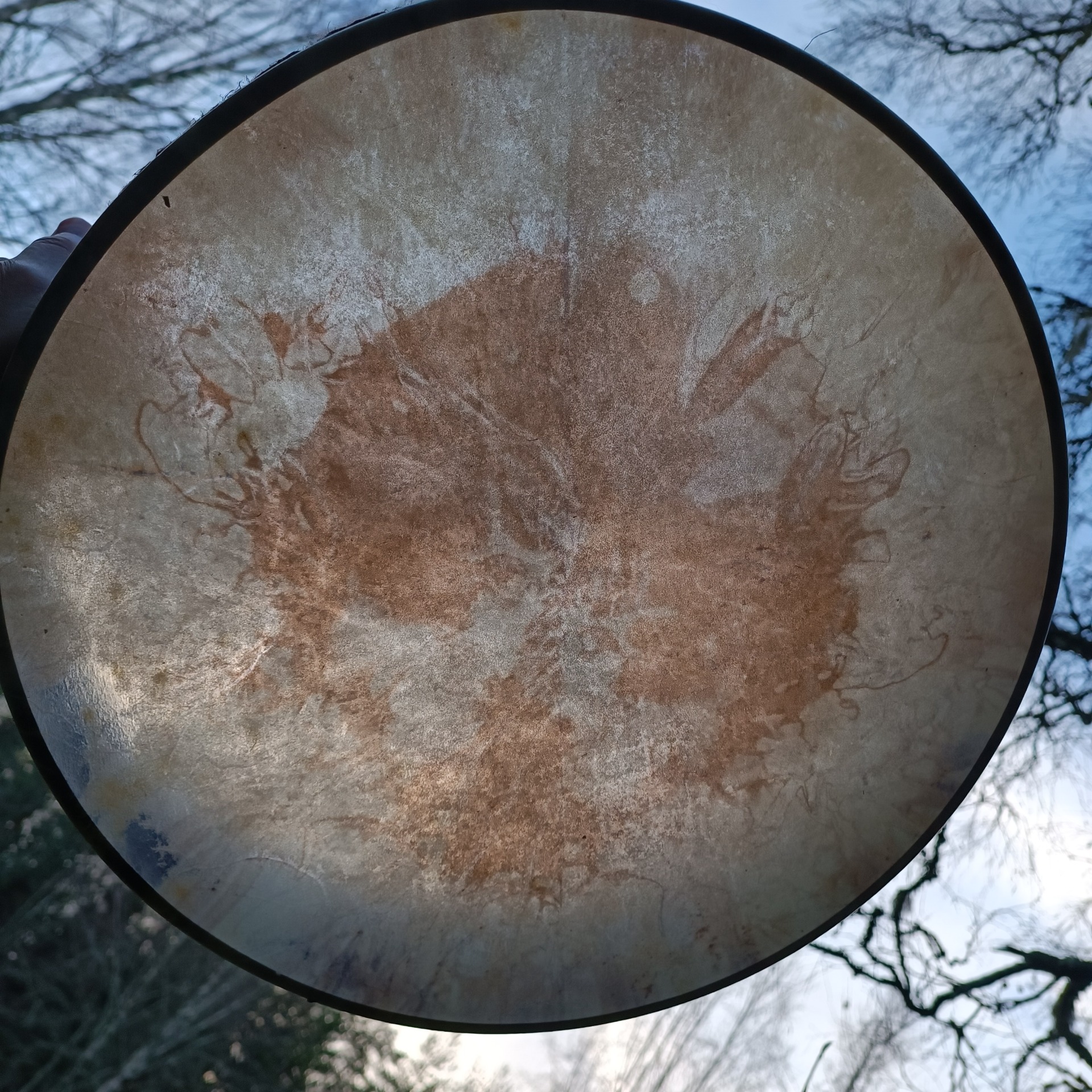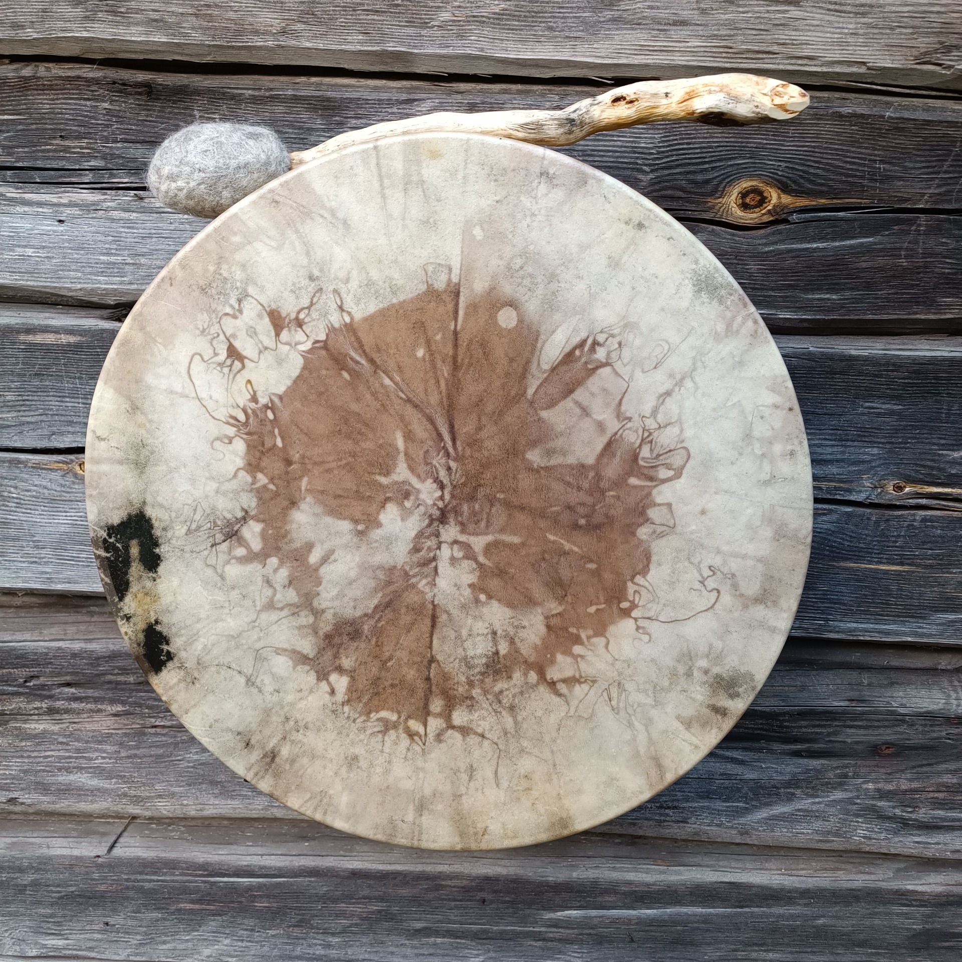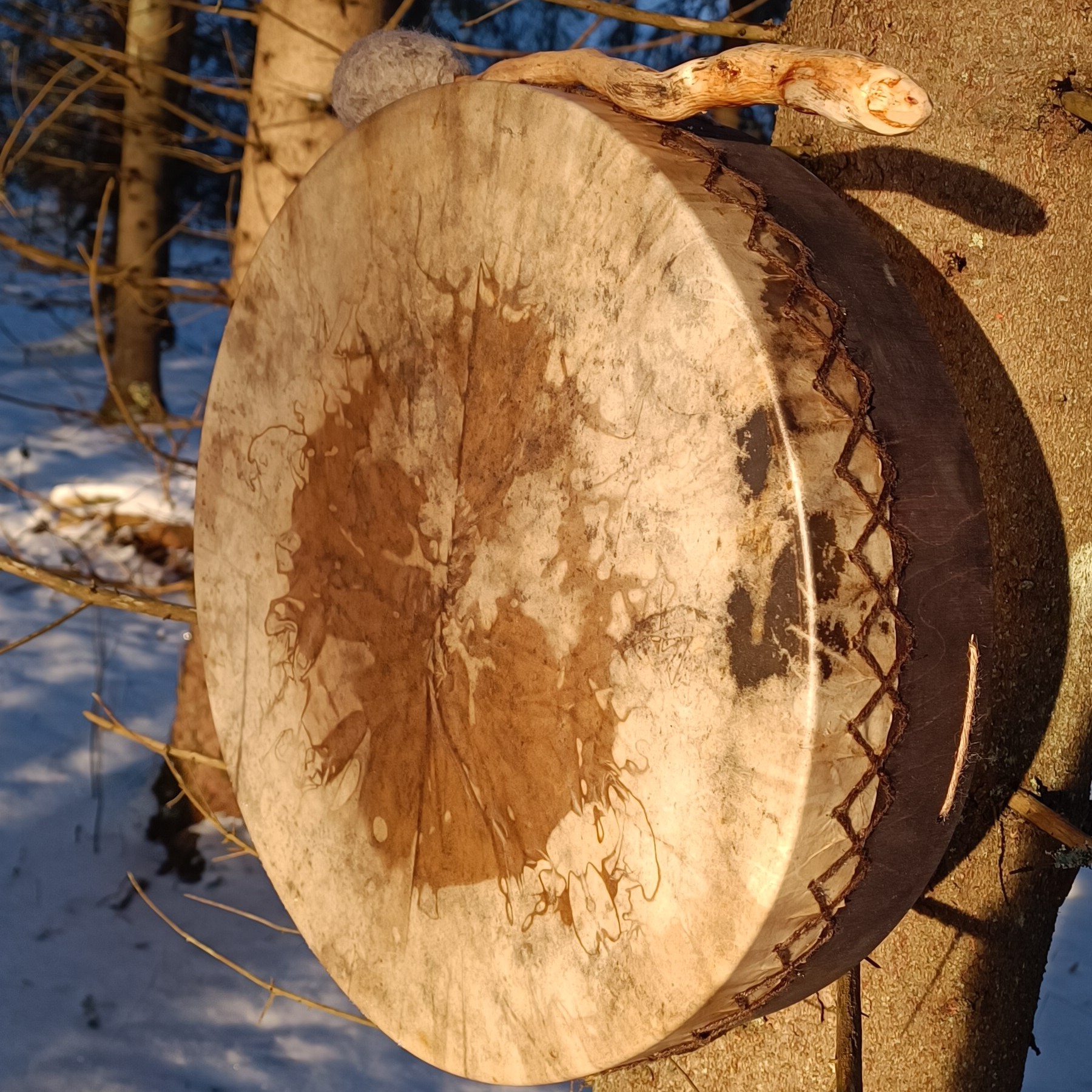 Perusrummun poronnahkainen kalvo on värjätty vesipetsillä ja koivuvanerinen kehä käsitelty luonnonmukaisella puuvahalla. Kehän mitat 41x10 cm, vahvuus 8mm.