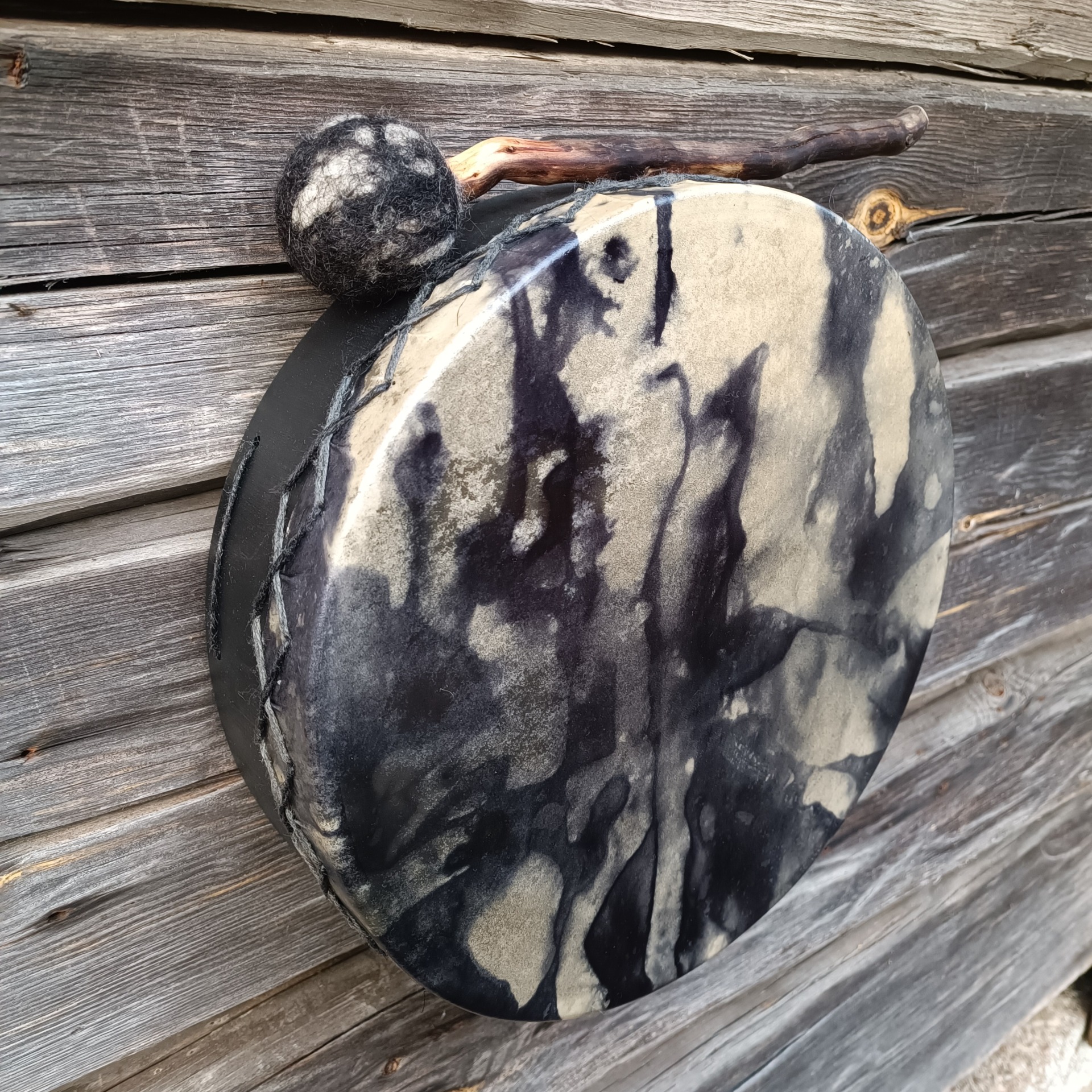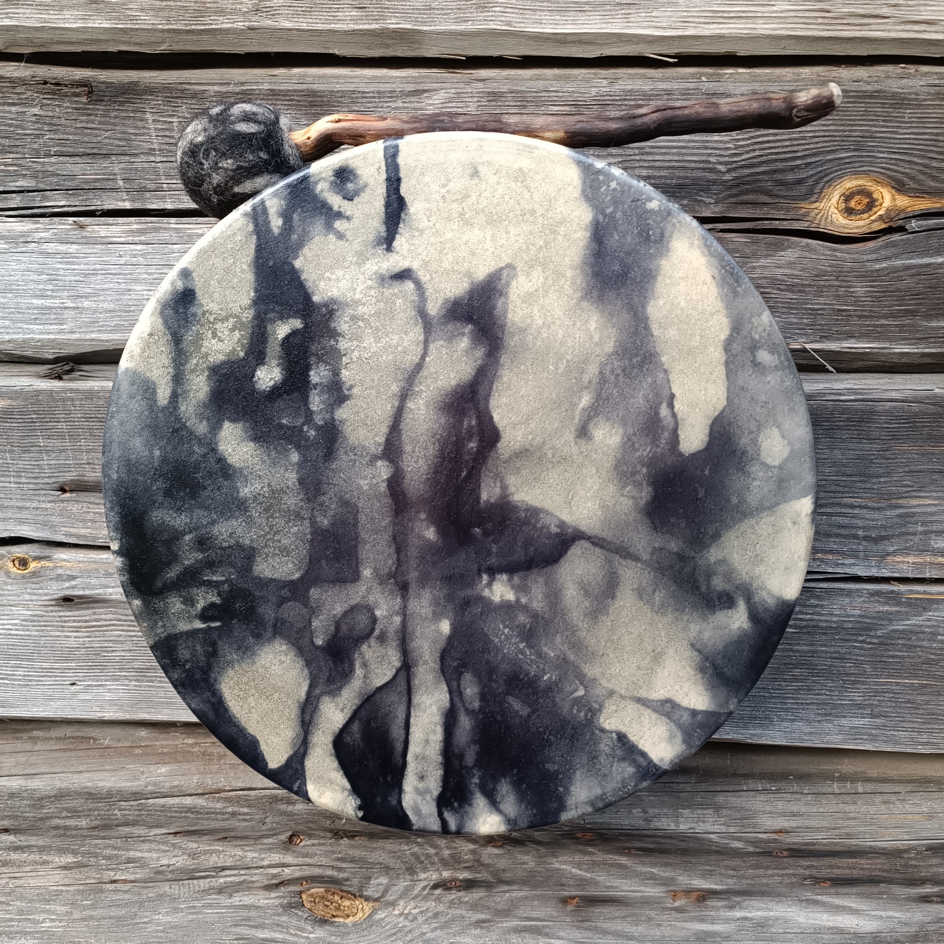 Perusrummun vahva poronnahkainen kalvo on värjätty mustalla vesipetsillä, vaaleat osat nahan omaa väriä. Koivuvanerinen kehä käsitelty luonnonmukaisella puuvahalla, mitat 31x8 cm, vahvuus 8 mm.