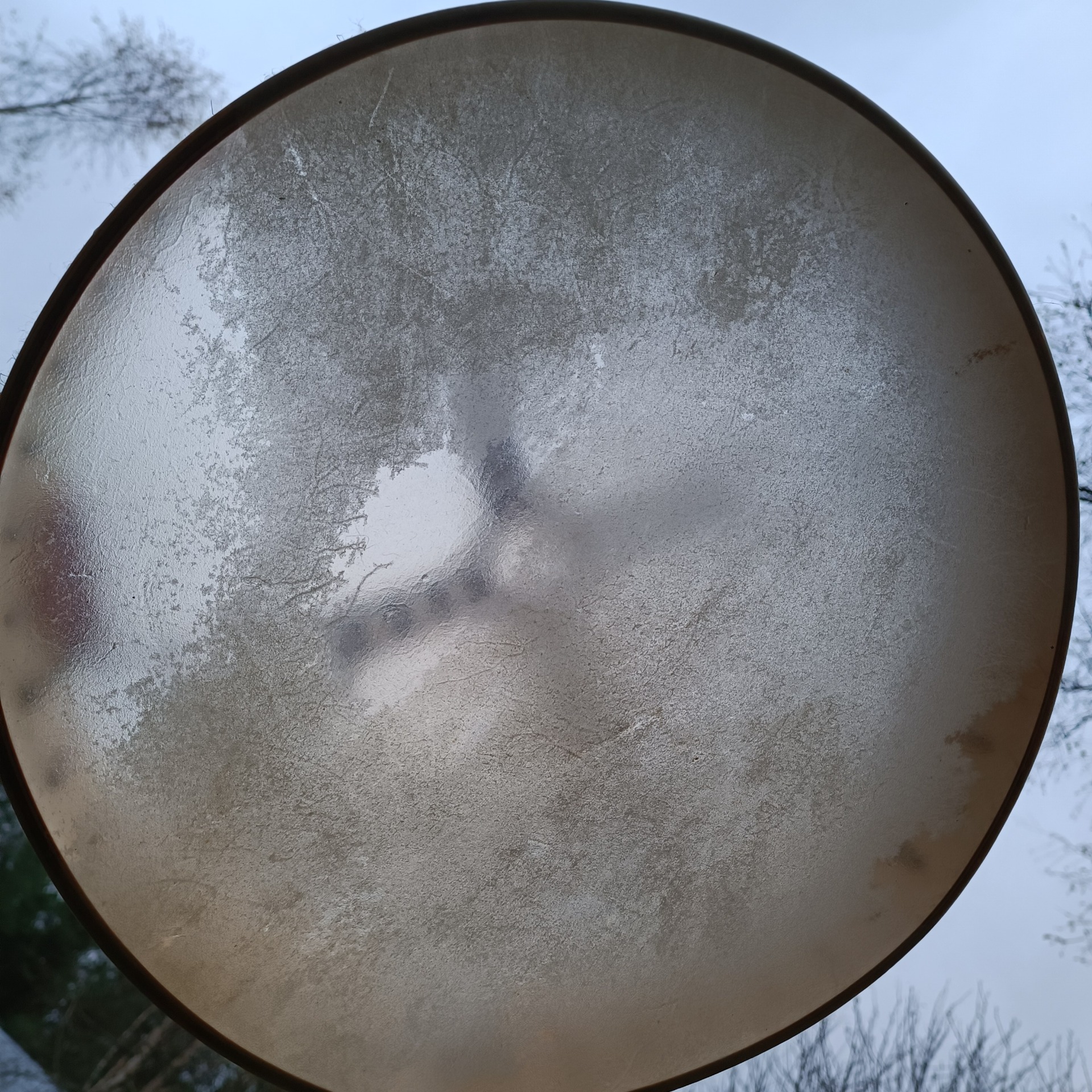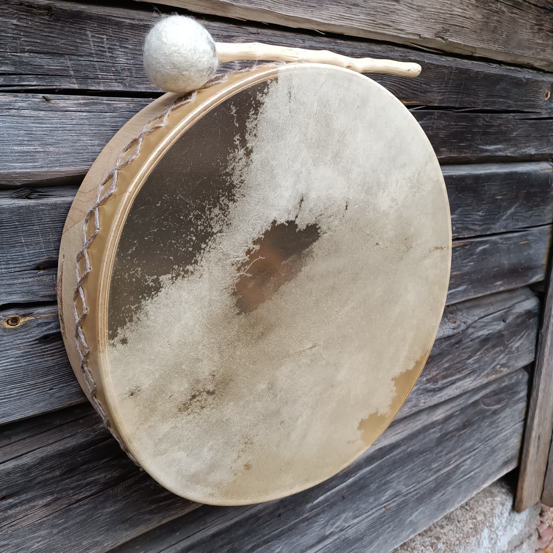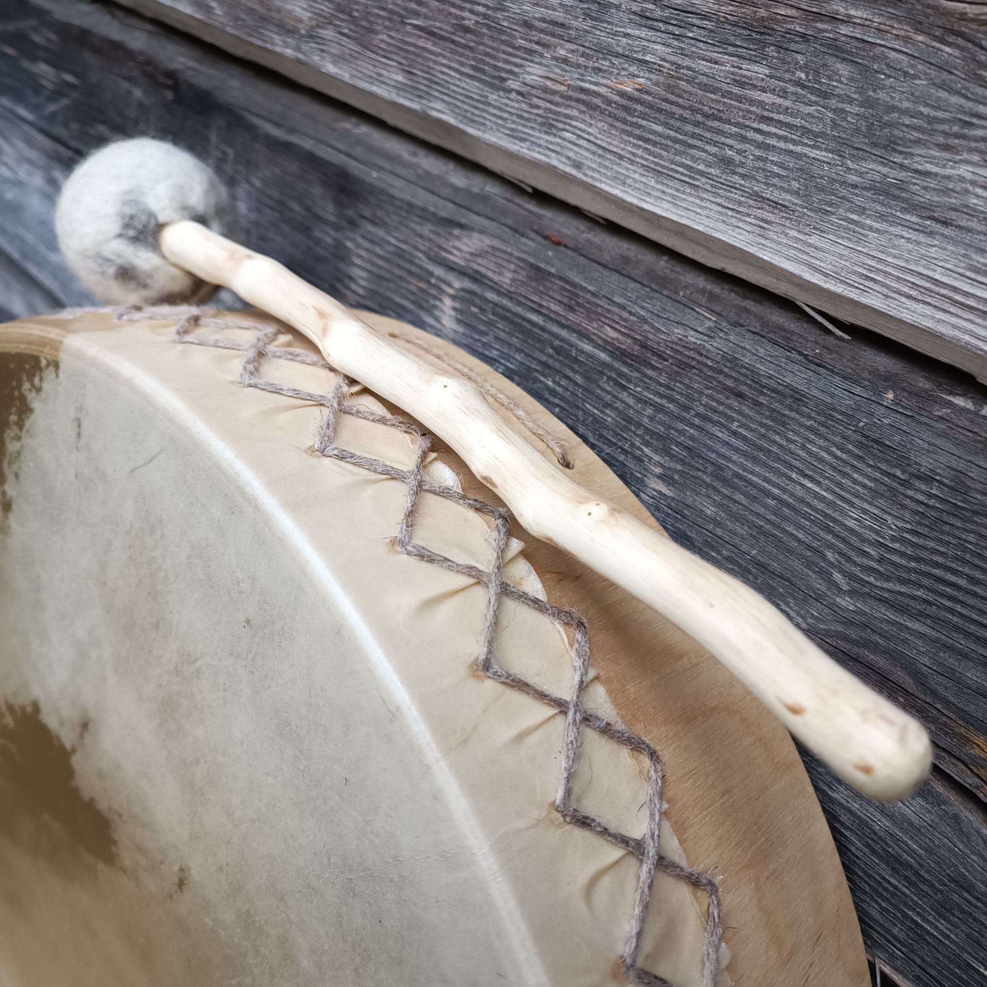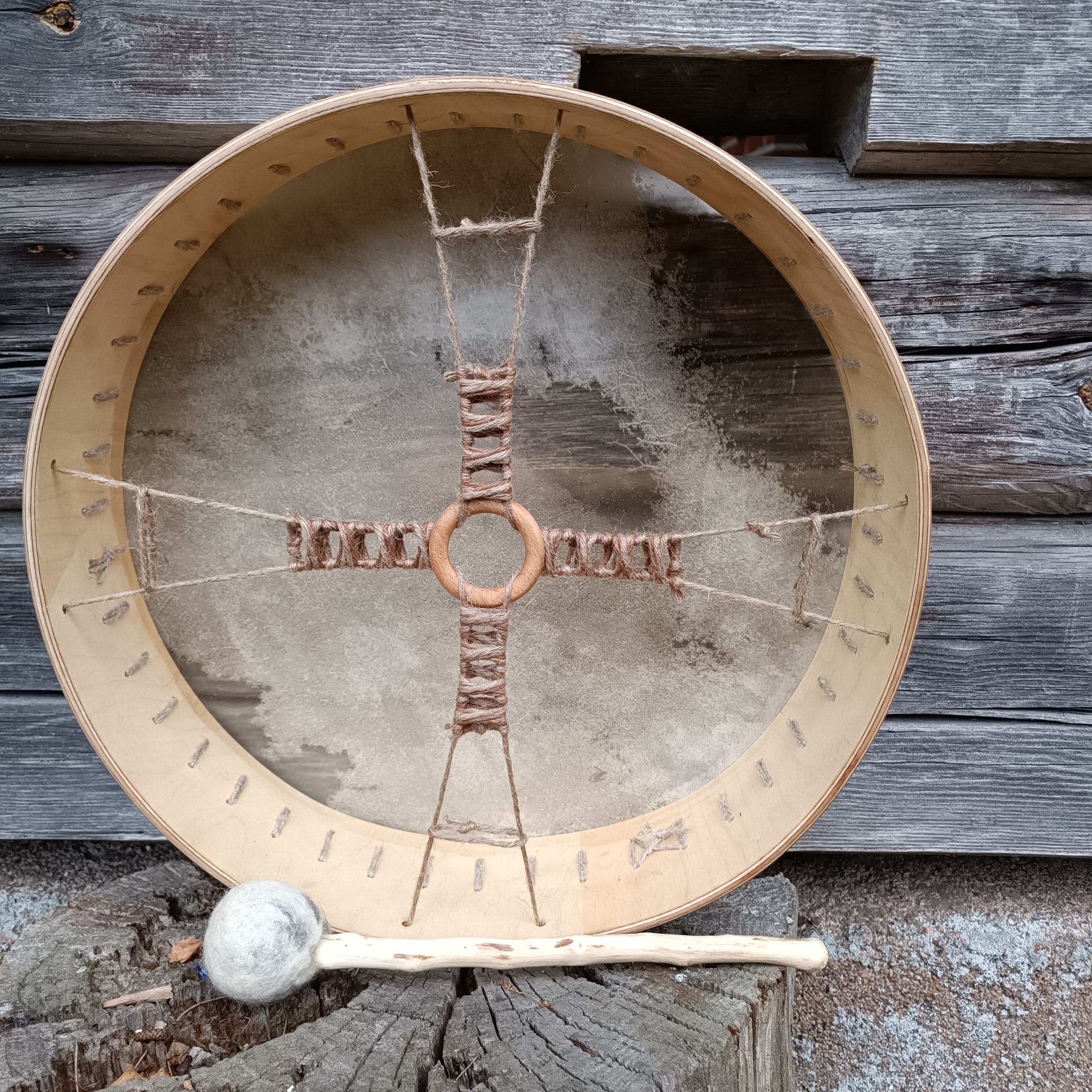 Perusrummun poronnahkainen kalvo on värjäämätön. Koivuvanerinen kehä käsitelty luonnonmukaisella puuvahalla, kehän mitat 41x10 cm, vahvuus 8 mm. Soittokapula on lampaanvillasta märkähuovutettu, vartena koivunjuuri. Mukana tulee rummun hoito-ohje ja ohjeistus shamaanirummun vihkimiseen