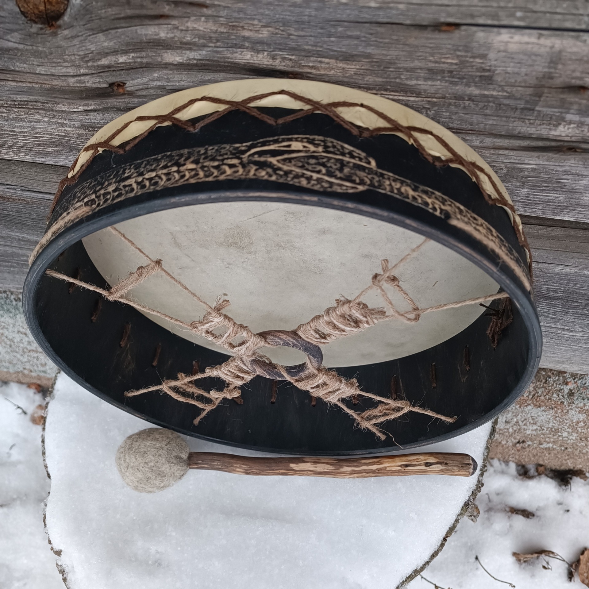 Pienen perusrummun poronnahkainen kalvo on värjäämätön. Koivuvanerinen kehä on käsitelty luonnonmukaisella puuvahalla ja ouroboros, käärme joka syö häntäänsä on kaiverrettu käsin ympäröimään kehää. Mitat 31x8 cm, kehän vahvuus 8 mm.