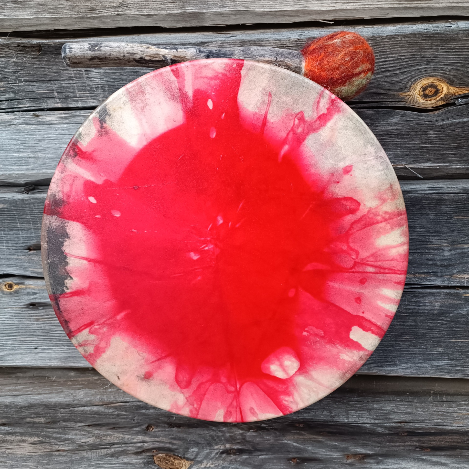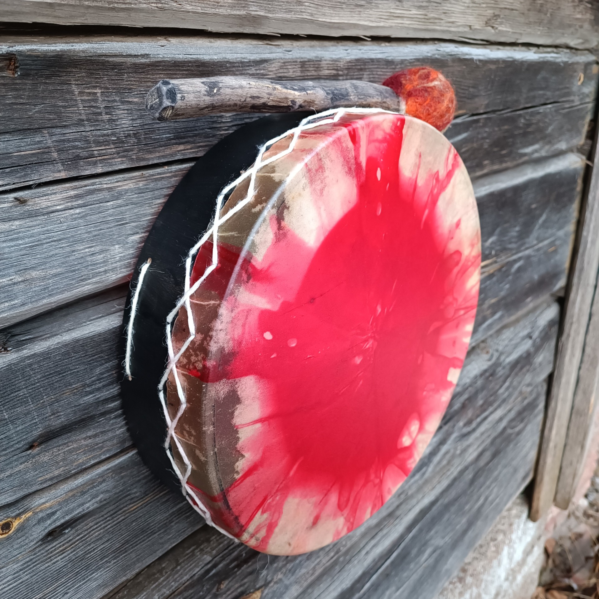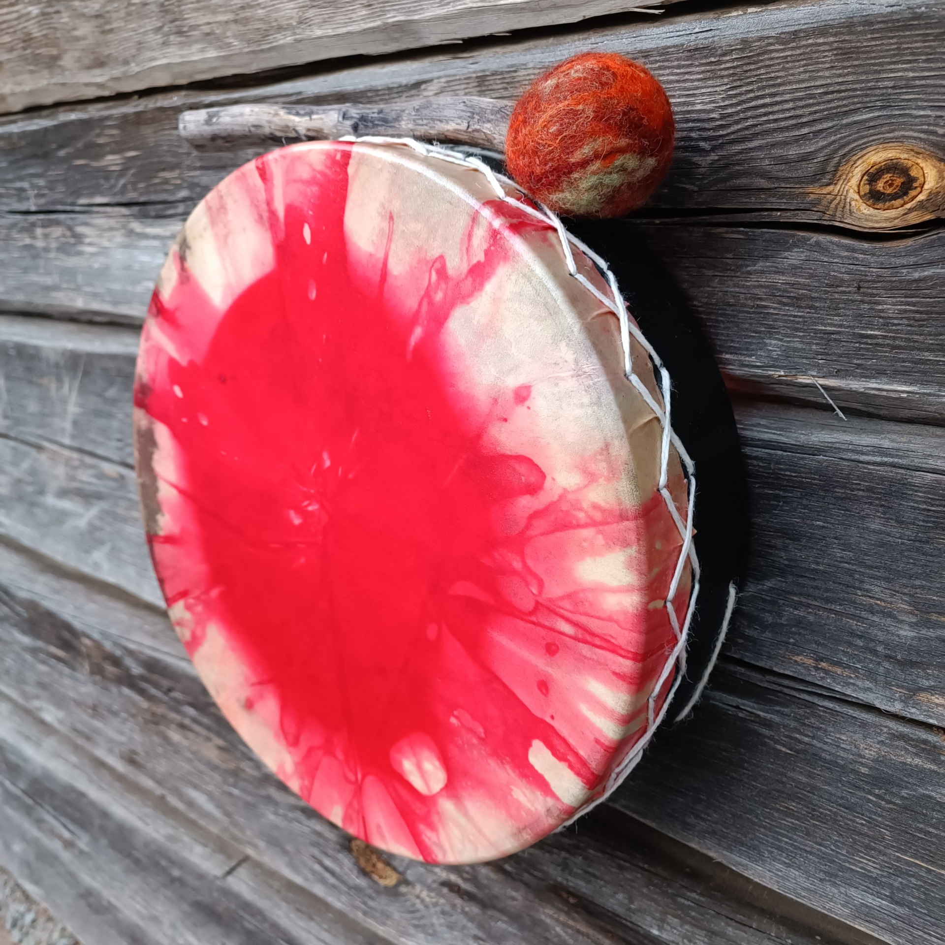 Pienen perusrummun poronnahkainen vahva kalvo on värjätty vesipetsillä ja koivuvanerinen kehä käsitelty luonnonmukaisella puuvahalla. Mitat 31x8 cm, vahvuus kehässä 8 mm. Soittokapula on lampaanvillasta märkähuovutettu koivunjuureen, juuri käsitelty luonnonmukaisella puuvahalla. Kapula on todella kevyt.
