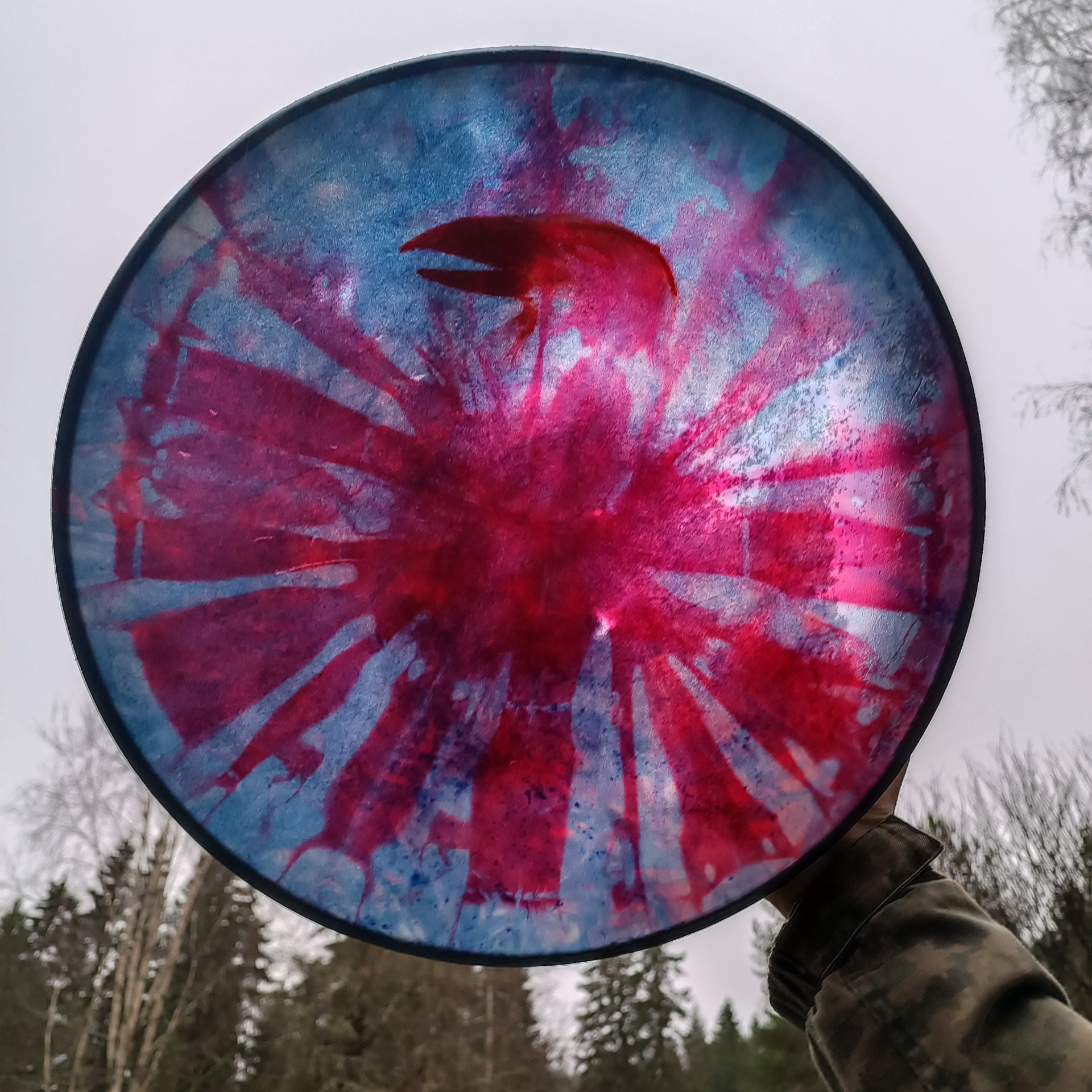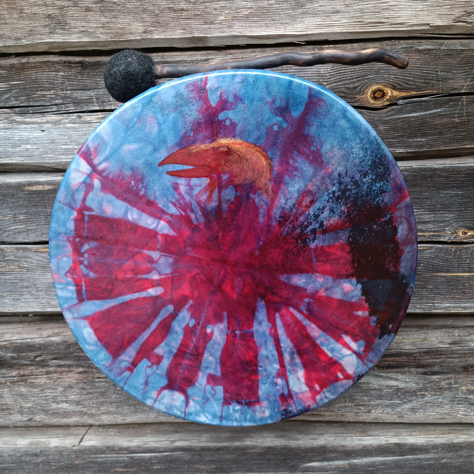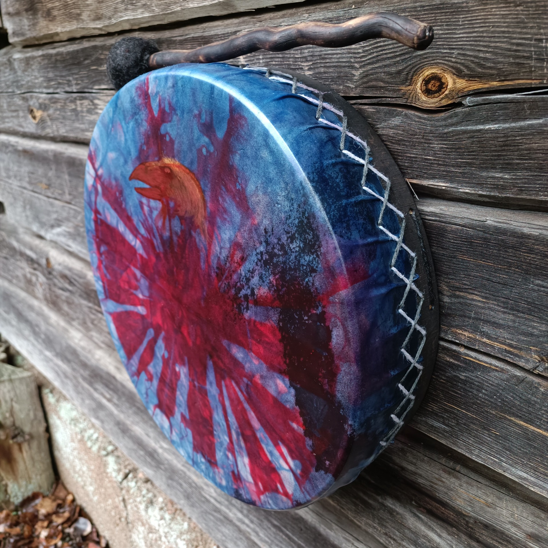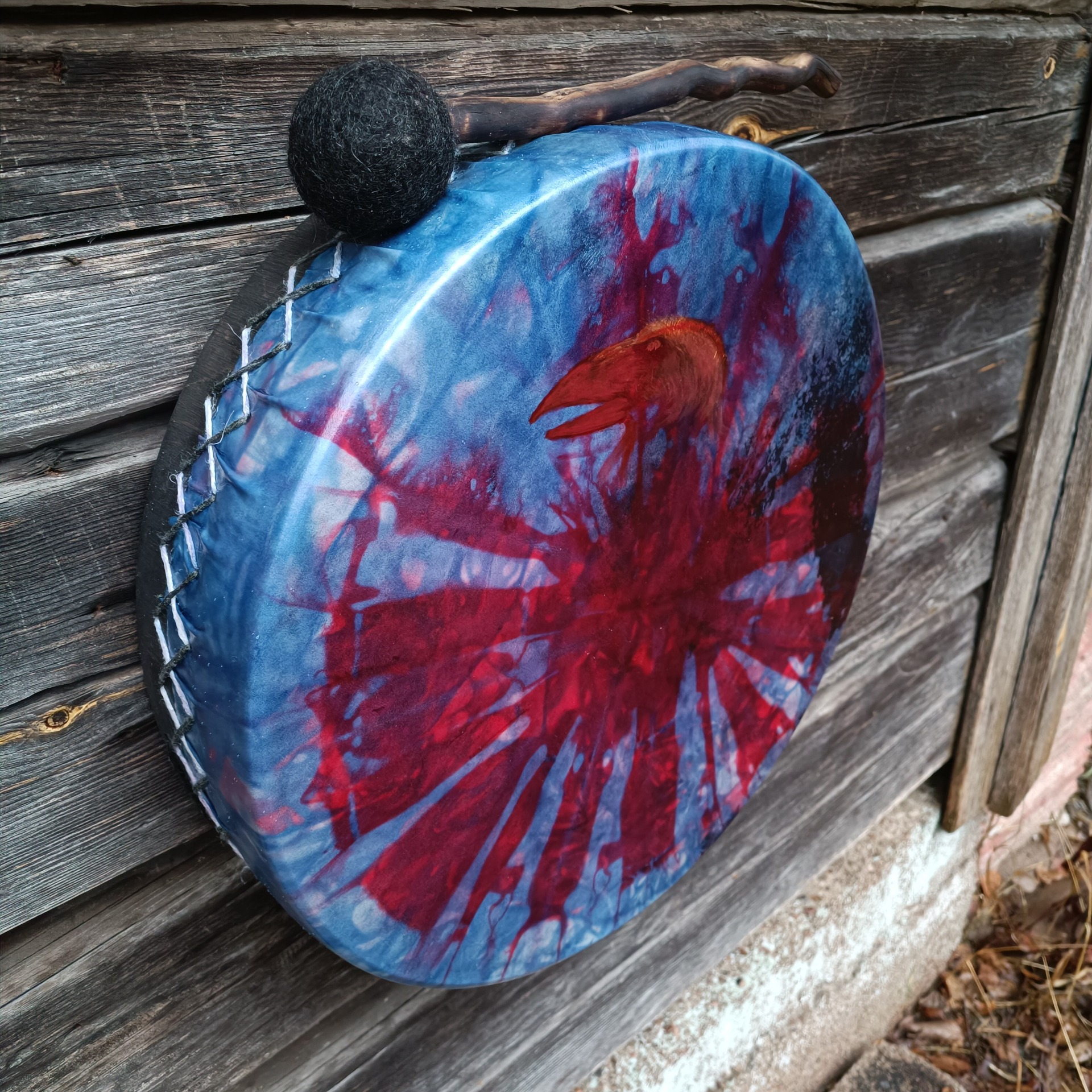 Rummun vahva poronnahkainen kalvo on värjätty vesipetsillä ja linnunpää maalattu akryylivärillä. Koivuvanerinen kehä on käsitelty luonnonmukaisella puuvahalla. Mitat 41x10 cm, vahvuus 8 mm. Rumpu on ilmapumpulla säädettävä. Nahan ja kehän välissä on polkupyörän sisuskumi, venttiili kehän sisäpuolella. Tämä mahdollistaa rummun virittämisen nopeasti soittokuntoon kosteallakin säällä, kun ei ole käytettävissä perinteisiä lämmönlähteitä. Sopii erinomaisesti esim esiintyville taiteilijoille, metsäjoogaan..
