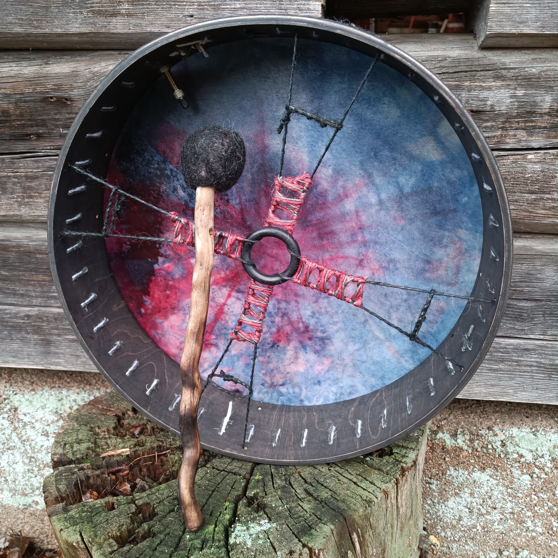 Mukaan tulee ilmapumppu, rummun hoito-ohje ja ohjeistus shamaanirummun vihkimiseen.