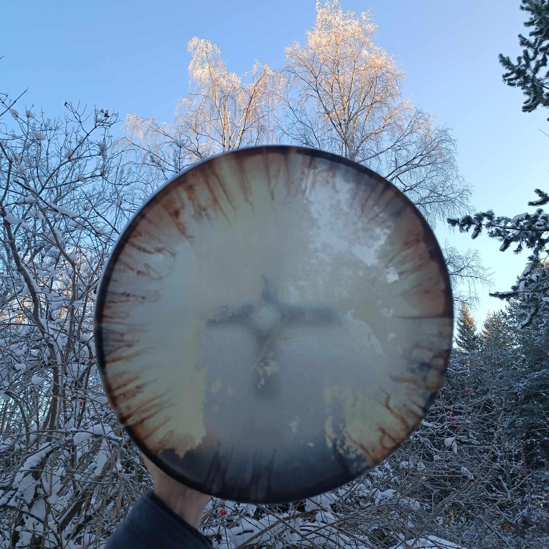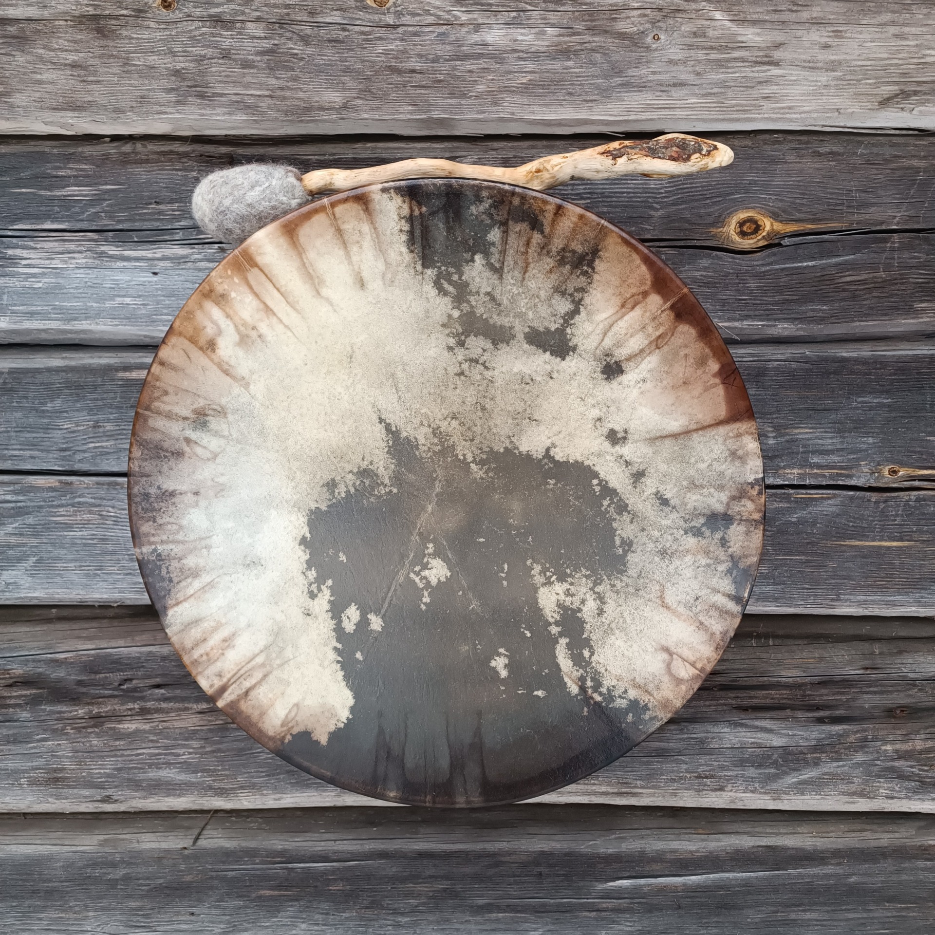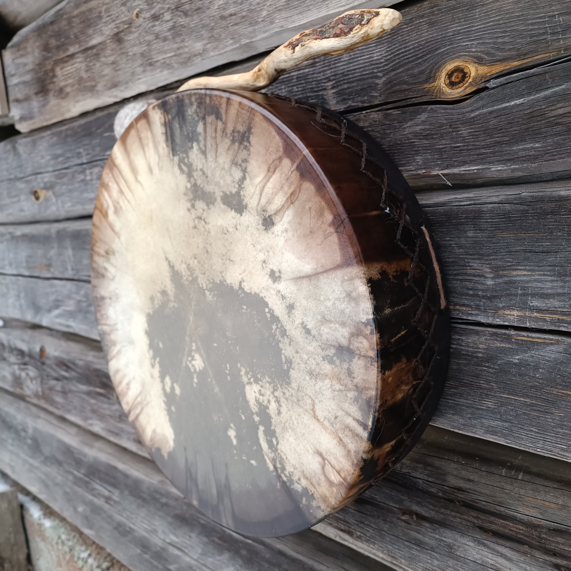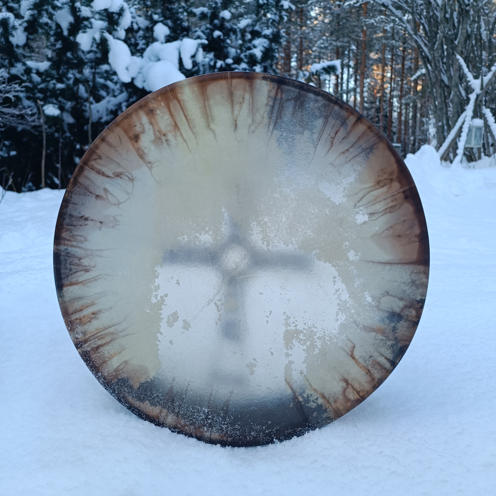 Säädettävän rummun vahva poronnahkainen kalvo on värjätty vesipetsillä. Kalvo on osittain läpikuultava. Koivuvanerinen kehä on käsitelty luonnonmukaisella puuvahalla. Kehän mitat 41x10cm, vahvuus 8 mm.