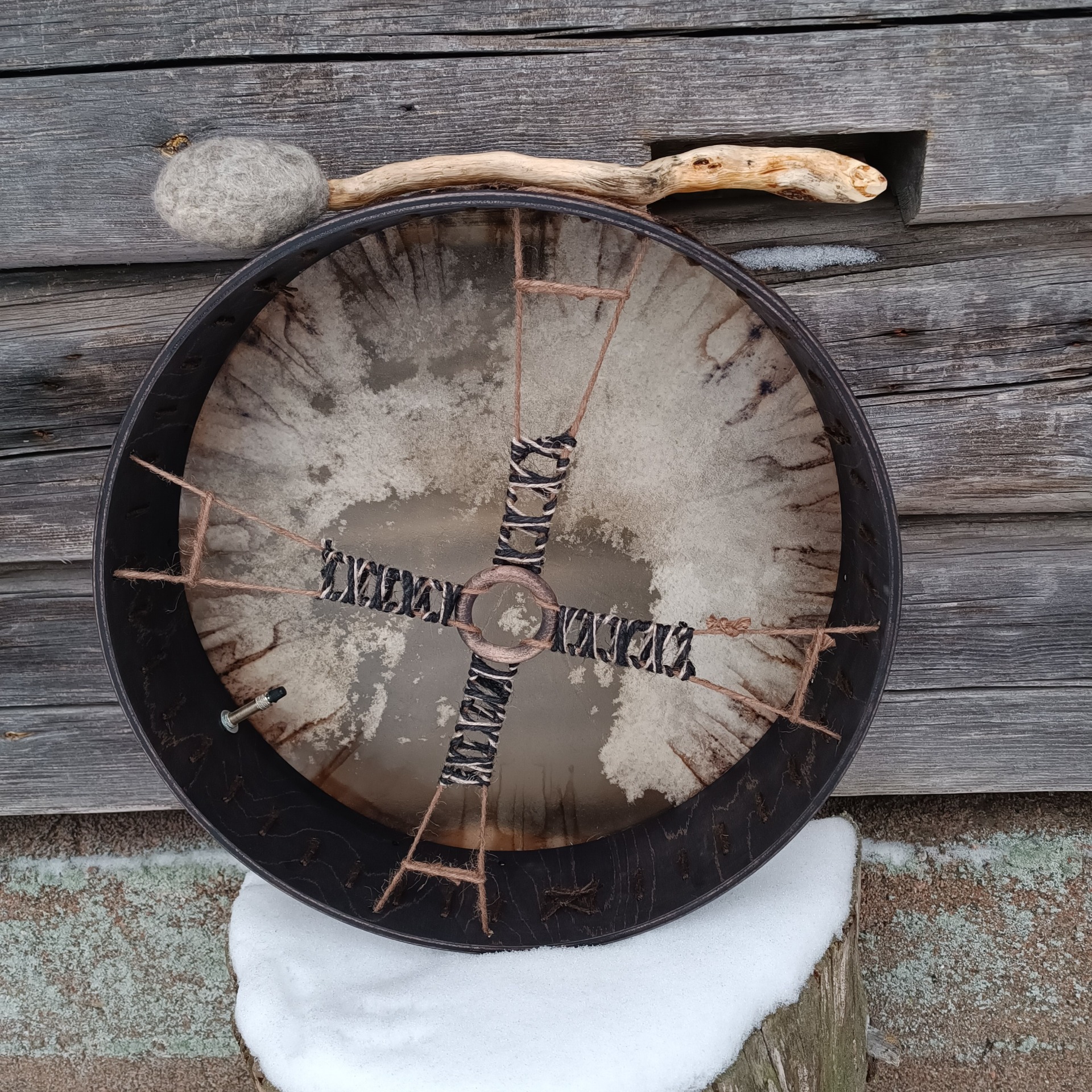 Mukana tulee ilmapumppu, rummun hoito-ohje ja ohjeistus shamaanirummun vihkimiseen.