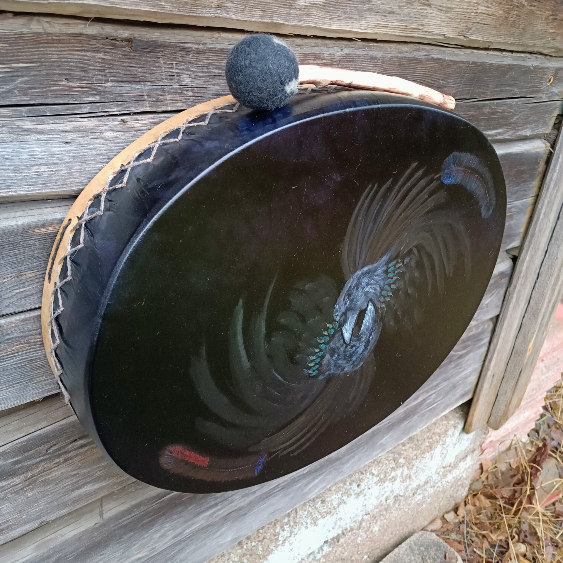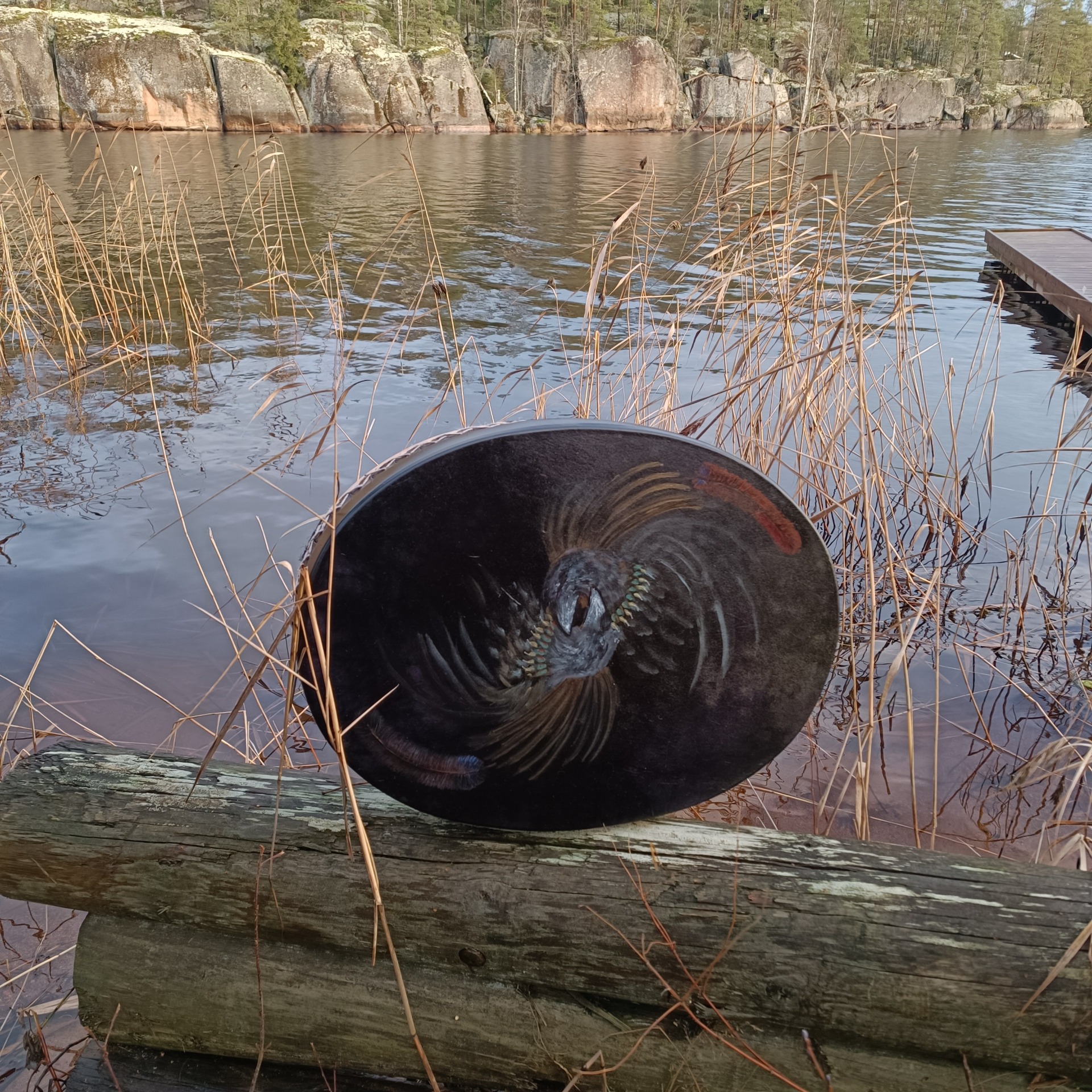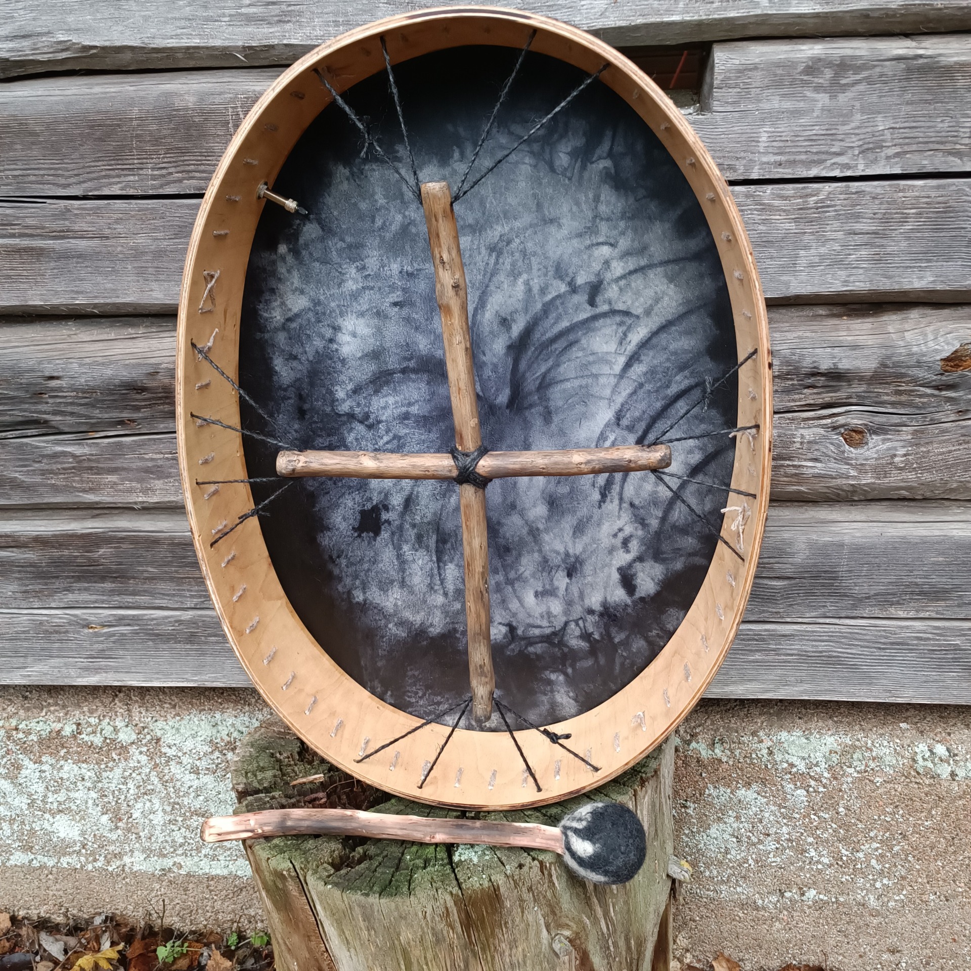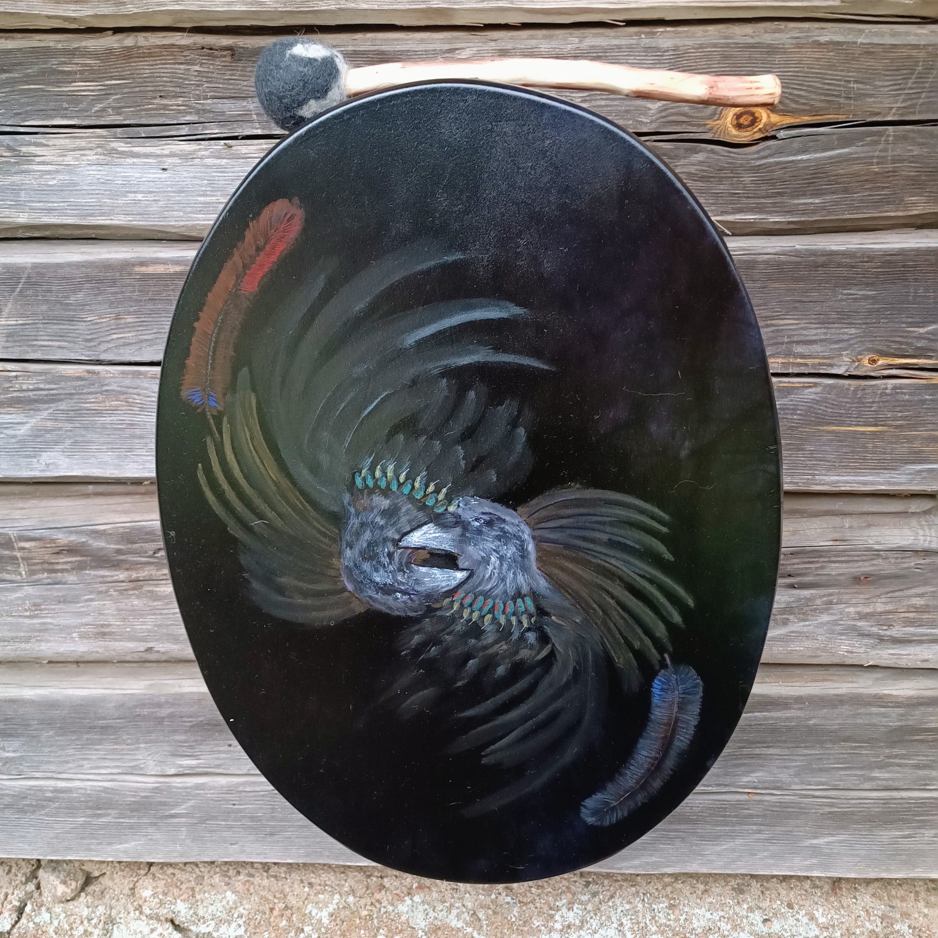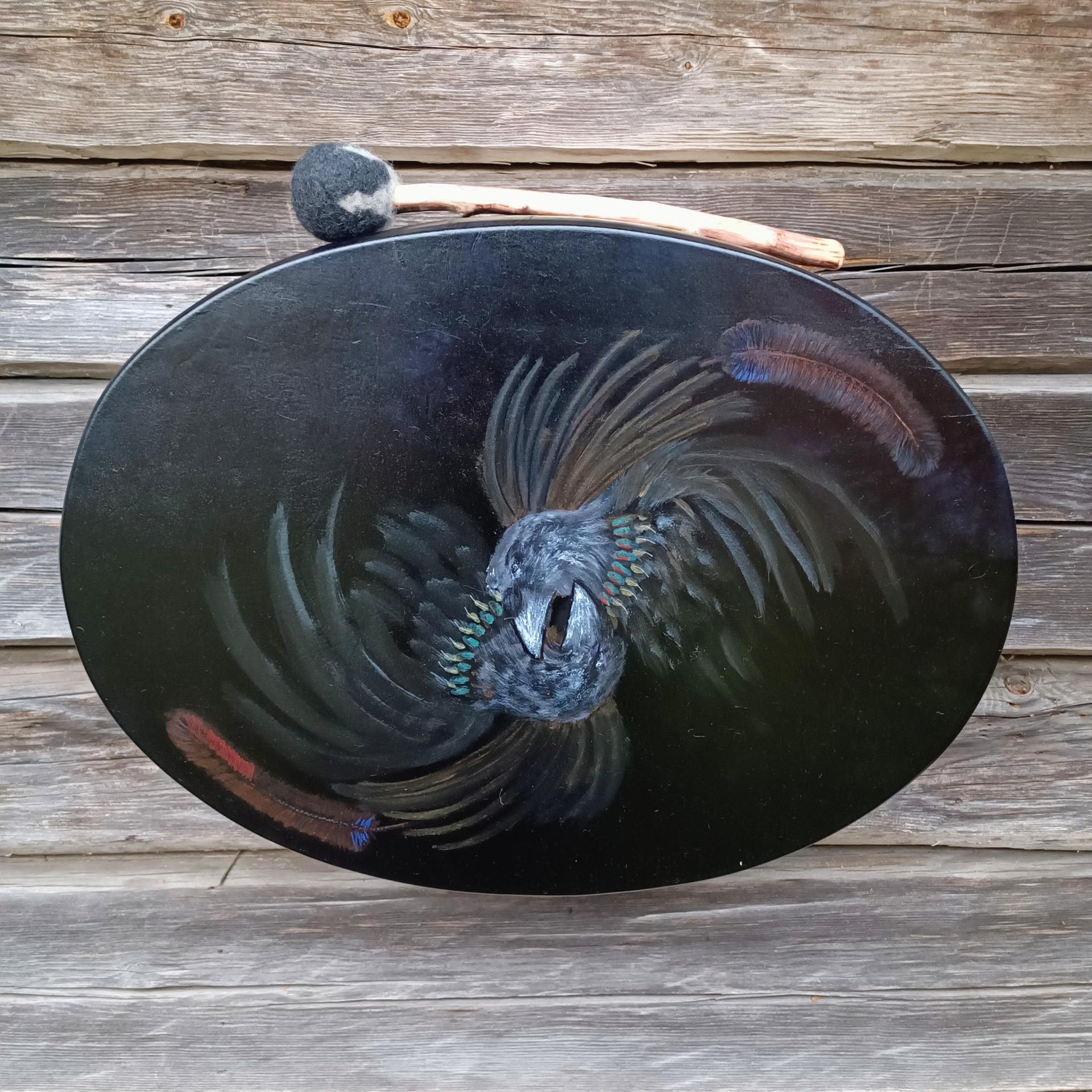 Säädettävän rummun vahva poronnahkainen kalvo on värjätty vesipetsillä ja korpit maalattu akryylivärillä. Koivuvanerinen kehä on käsitelty luonnonmukaisella puuvahalla. Kehän mitat 60x44x11,5 cm.