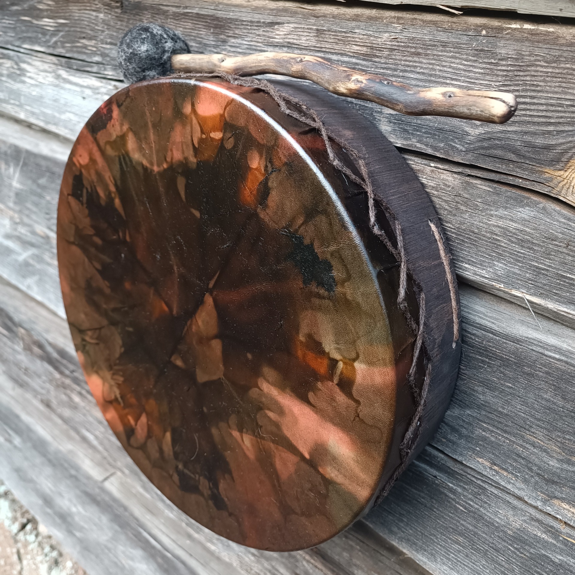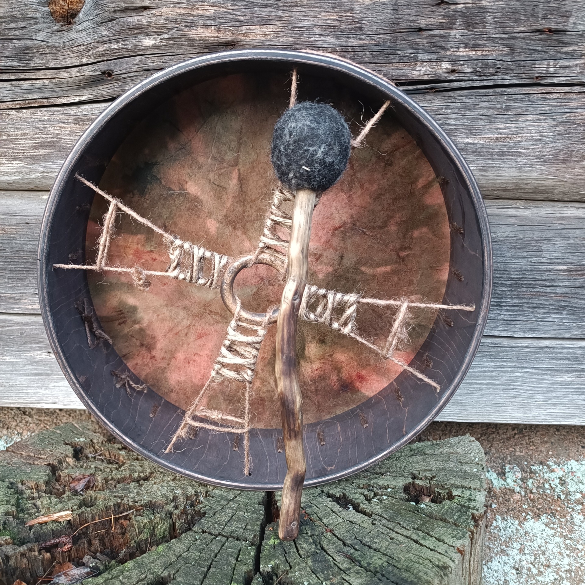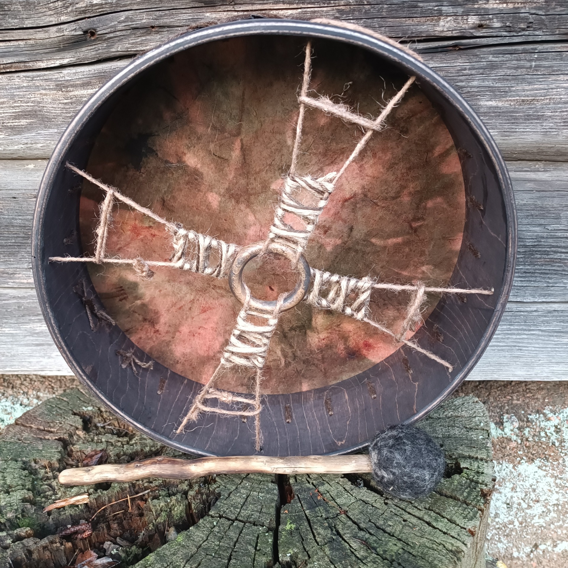 Perusrummun poronnahkainen kalvo on värjätty kahdessa kasviväriliemessä, nokkosella ja krappijuurella. Koivuvanerinen kehä käsitelty luonnonmukaisella puuvahalla. Kehän mitat 31x8 cm, vahvuus 8 mm. Rummun paino 450g.