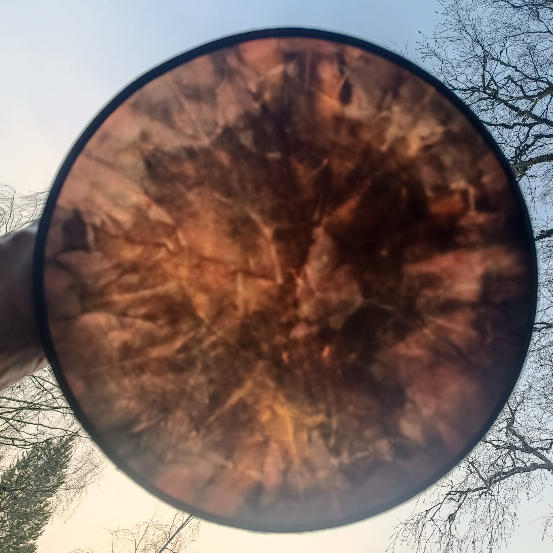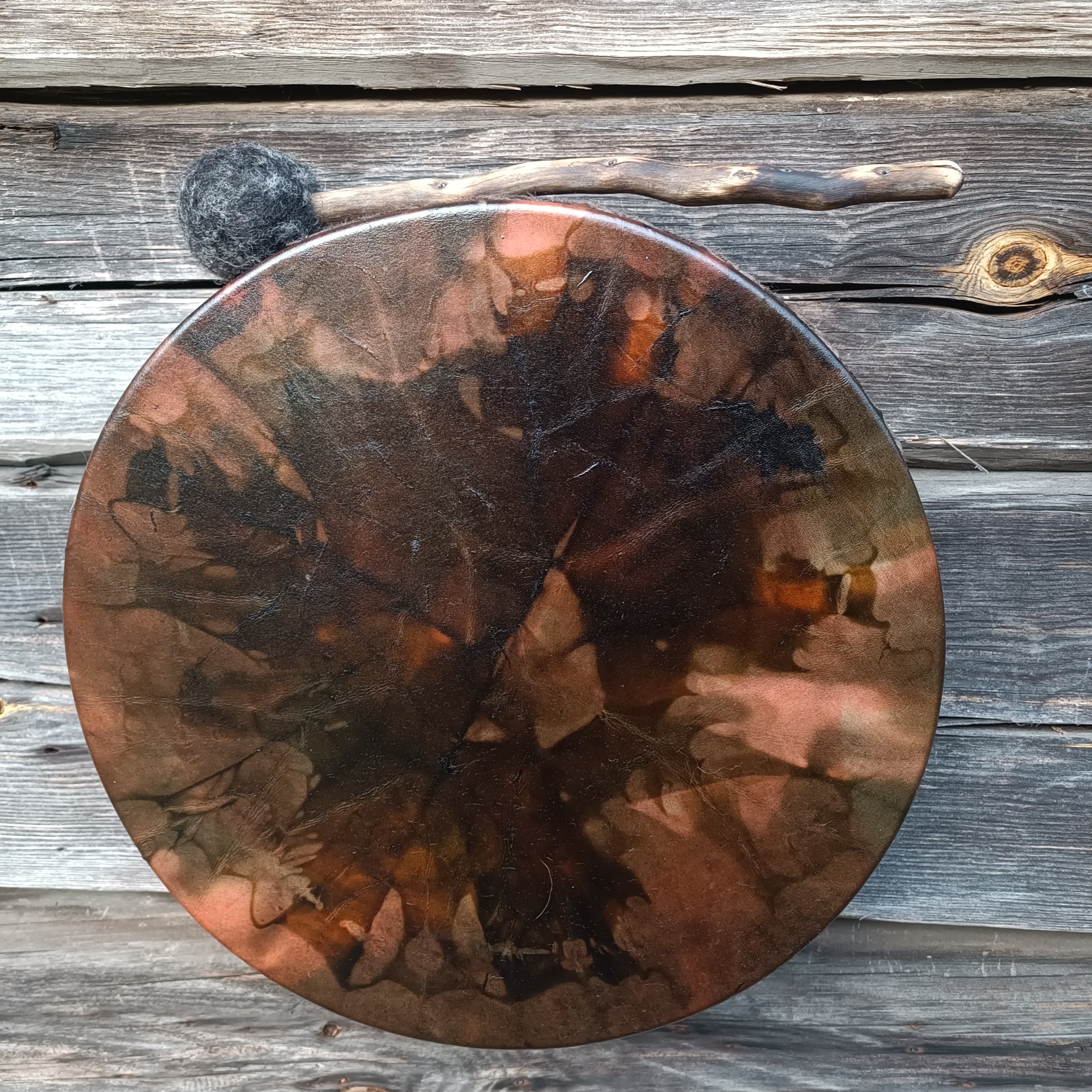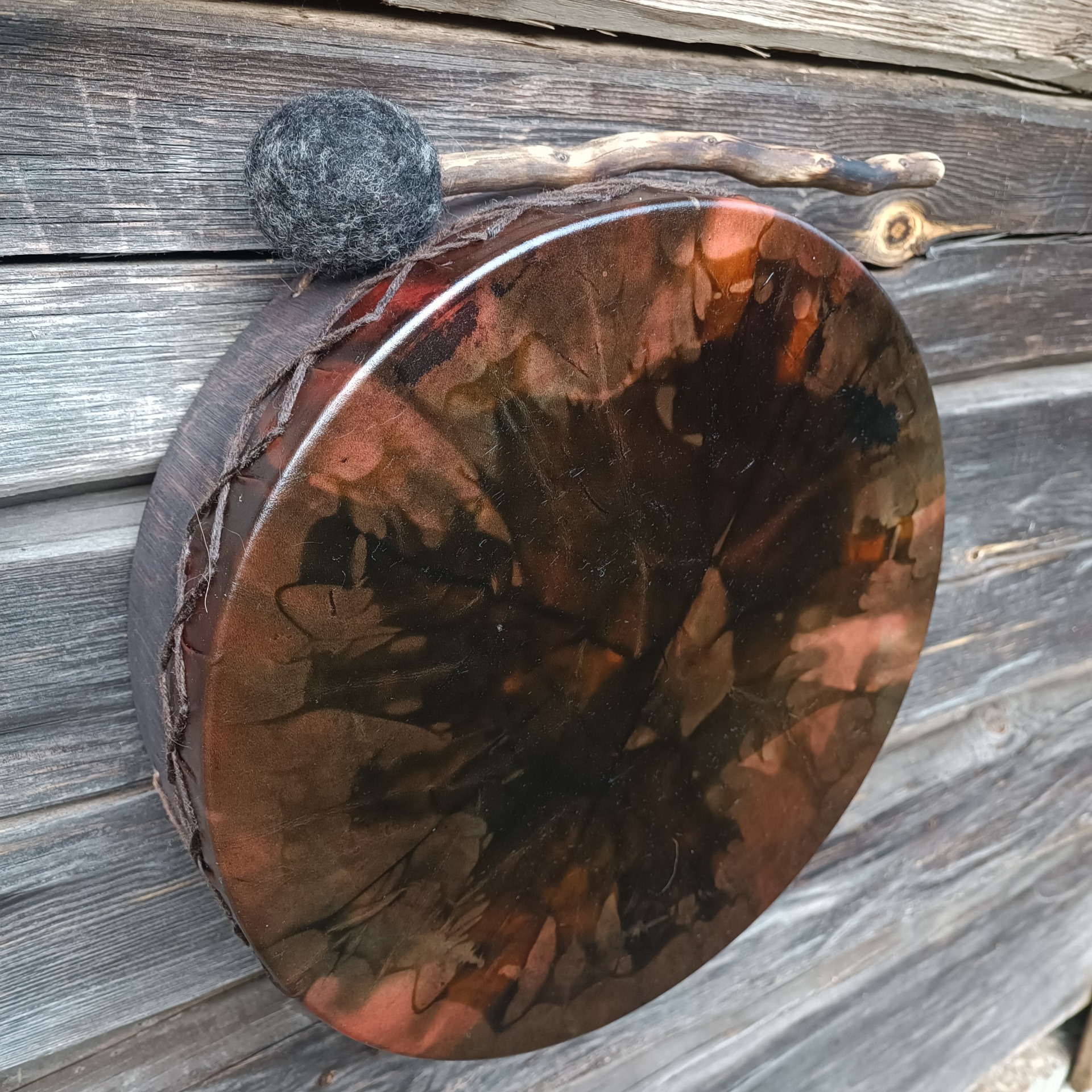 Perusrummun poronnahkainen kalvo on värjätty kahdessa kasviväriliemessä, nokkosella ja krappijuurella. Koivuvanerinen kehä käsitelty luonnonmukaisella puuvahalla. Kehän mitat 31x8 cm, vahvuus 8 mm. Rummun paino 450g.