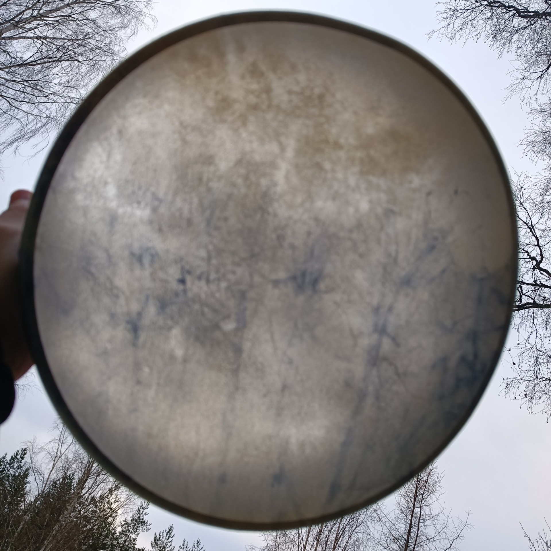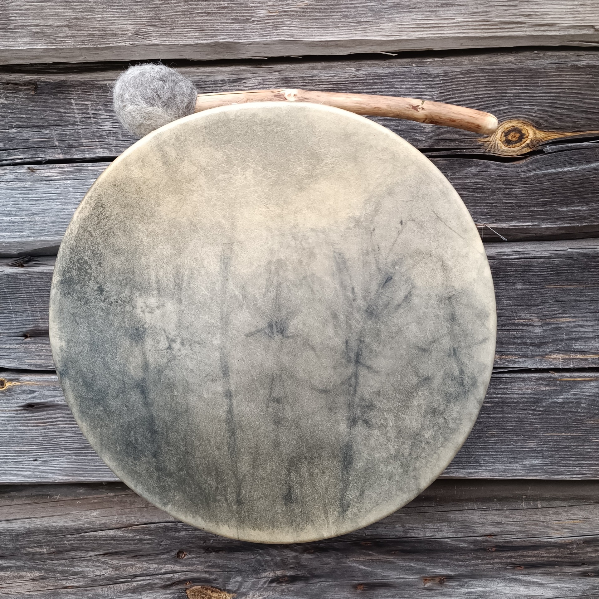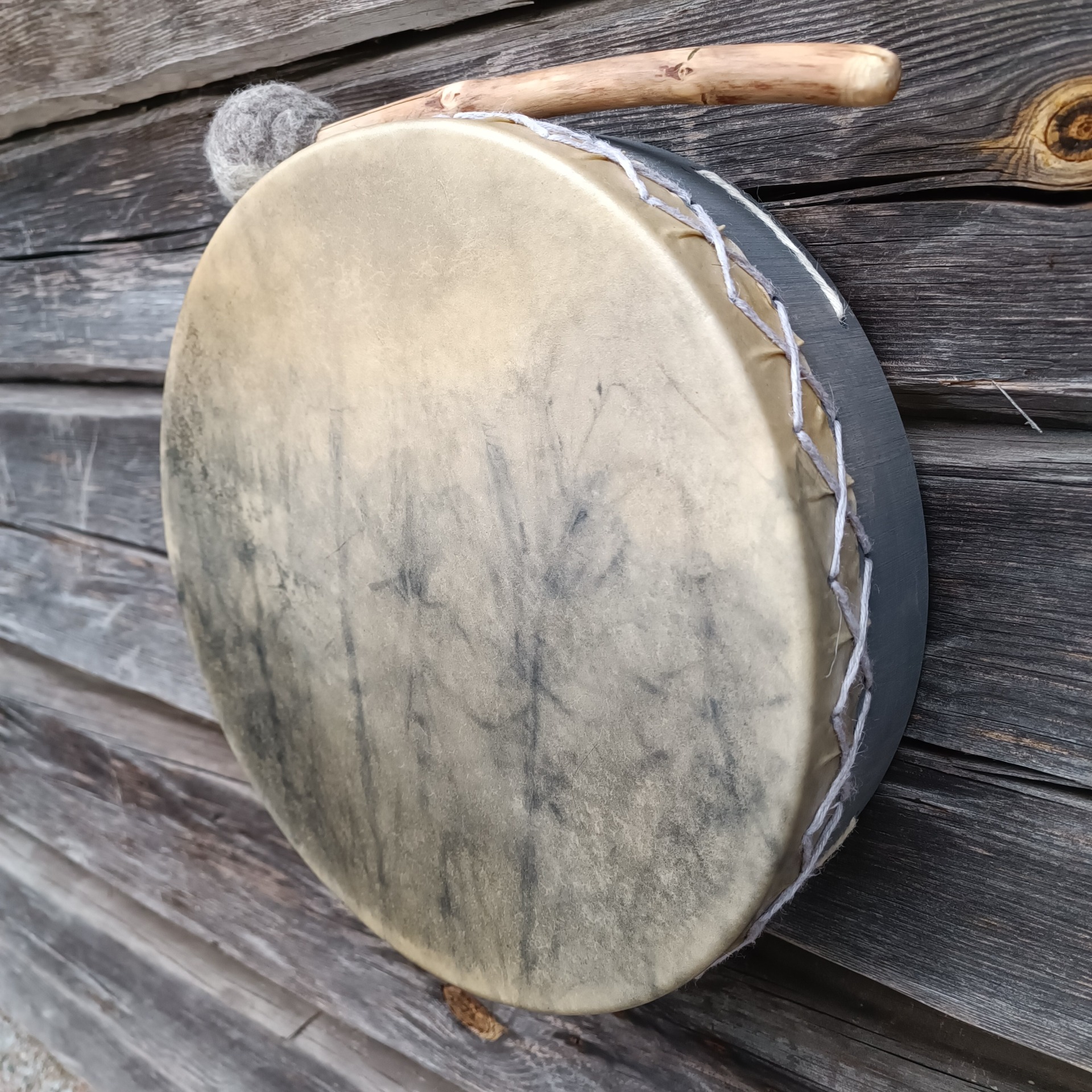 Perusrummun vahva poronnahkainen kalvo on värjätty vesipetsillä, vaalea osa kalvon omaa väriä. Koivuvanerinen kehä käsitelty luonnonmukaisella puuvahalla. Kehän mitat 31x8 cm, vahvuus 8 mm